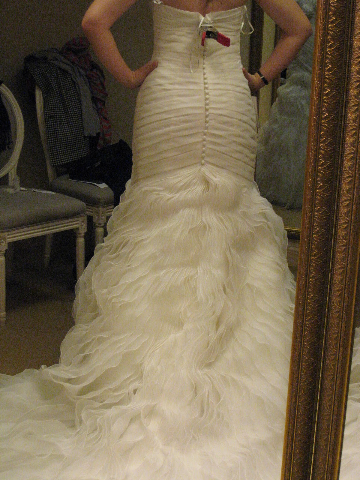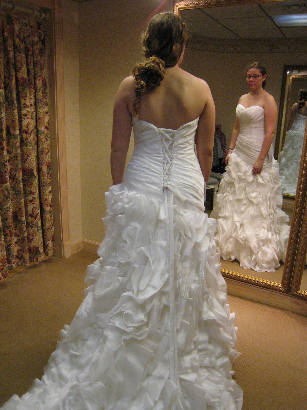 When I tried it on, we all agreed that the third boob (flower in the middle of the bust) would need to go, and that while the ruffles on the bust brought a nice detail to the top and made me look fuller, it was too much going on with the rest of the dress, especially since the bottom was so full. After showing this picture to MOH E, she said the bottom scared her and looked like hair. This one was officially off the list.