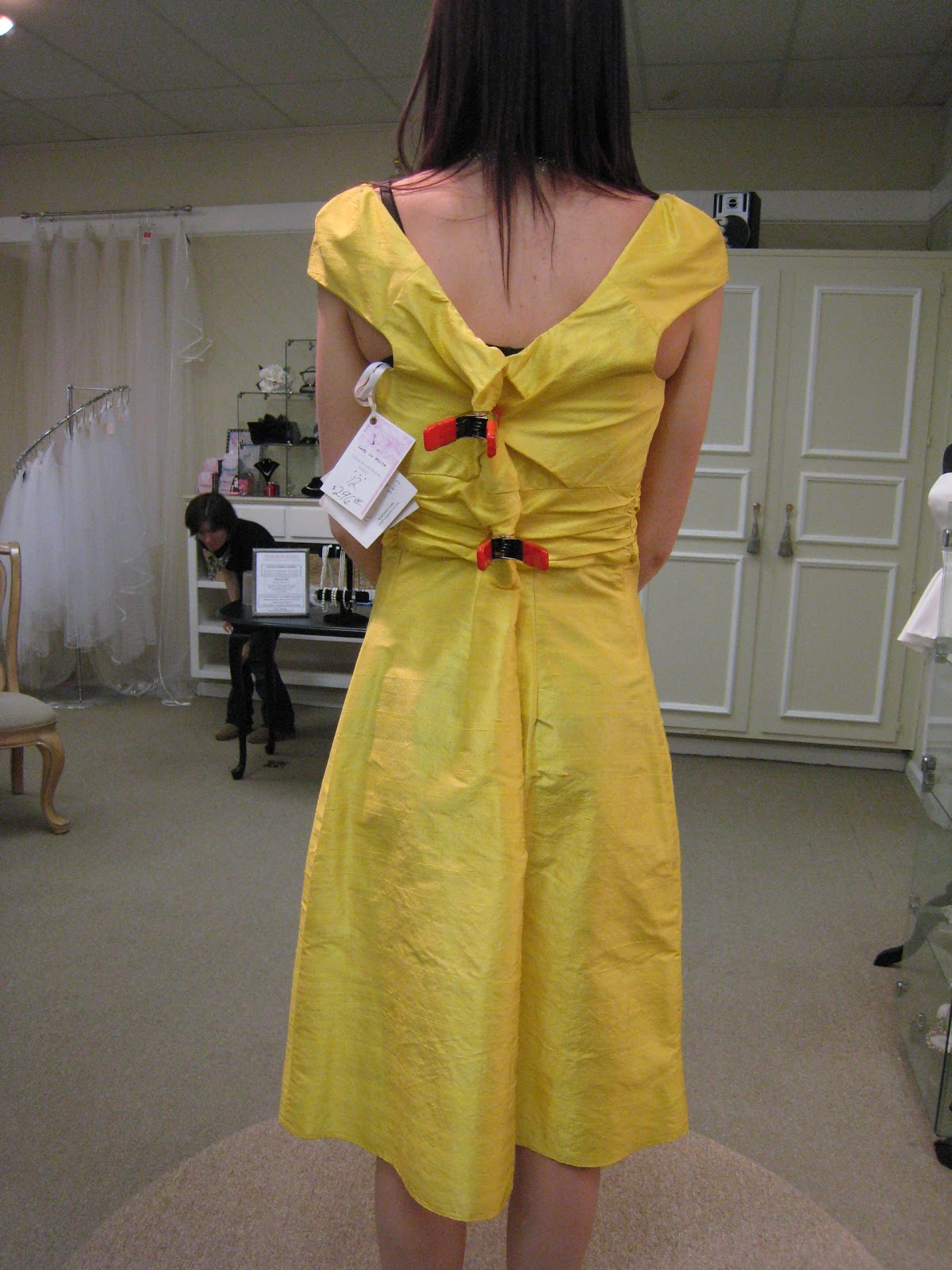 I thought that this dress looked really nice with the pickups removed, but I preferred having a belt to define the waistline, so the consultant removed the necklace and added a belt, which I don't know the designer of.