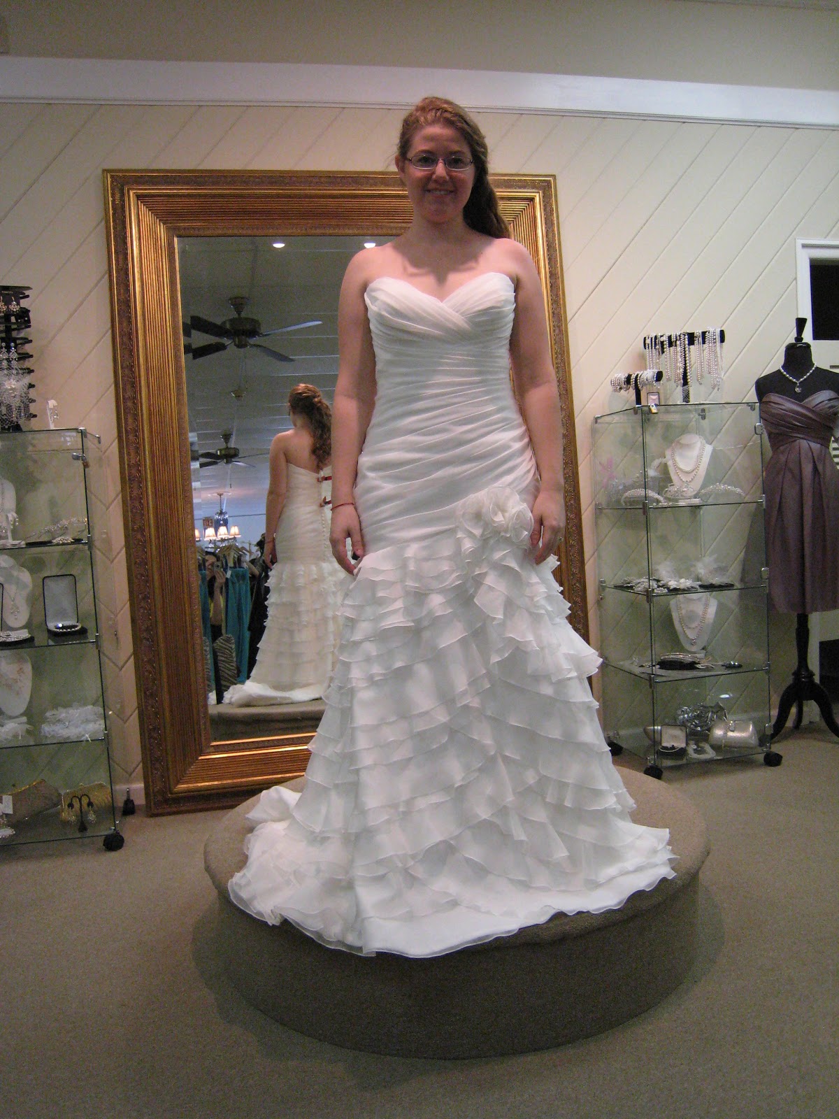Since I originally made the appointment for MOH E to find her dress, I really wasn't prepared to try any on myself, and wasn't really all that excited about it. But, I obliged, and tried some on anyway.