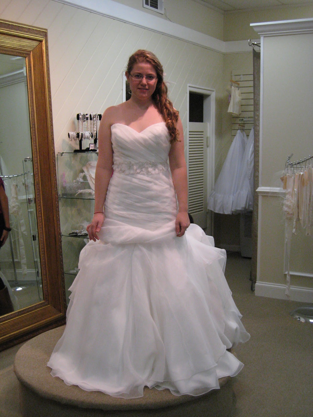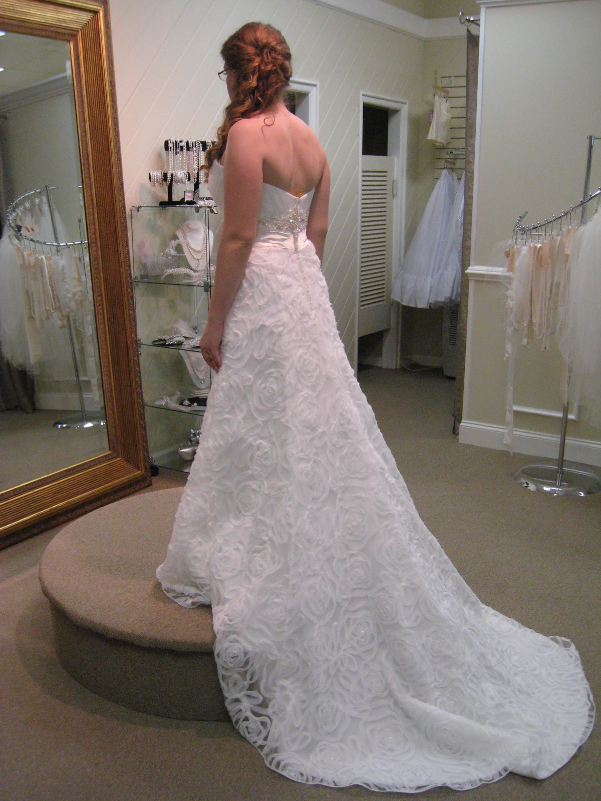 It was a really nice dress, and the train was amazing, even though I don't really want a train, haha. But overall, the beading under the bust was too ornate for my liking, and the sweetheart neckline was too deep. But, it was a really nice dress, and the sample fit really well - we didn't even use clips!