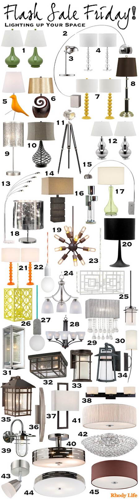 1. Samuels Table Lamp Set in Fern Green via One Kings Lane  2. Zuo Gravity Floor Lamp via Gilt  3. Zuo Cyber Table Lamp via Gilt  4. Karl Stacked Crystal Ball Lamp Set via One Kings Lane  5. Yellow Twitter Bird Contemporary Accent Lamp via 55 Downing Street  6. Janae Table Lamps in Dark Brown via Wayfair  7. Knot Table Lamp Set in Yellow via One Kings Lane  8. Candice Olson Lighting Scope Telescoping Table Lamp in Bronze/Satin Nickel via MyHabit  9. Cut-Out Steel Tree Pattern Accent Table Lamp via 55 Downing Street  10. Pulaski Brunswick Table Lamp via Joss & Main  11. Wilde Light via HomeSav  12. Angela Table Lamp Set in Silver via One Kings Lane  13. Zuo Cosmic Floor Lamp via Gilt  14. Blog Table Lamp in Walnut via Wayfair  15. Control Brand Arch Floor Lamp via Gilt  16. Stromae Table Lamp in Smoke via HomeSav  17. Table Lamp in Green via Wayfair  18. Zuo Supernova Table Lamp via Gilt  19. Zuo Small Sapphire Ceiling Lamp via Gilt  20.  LexMod Spun Style Table Lamp via MyHabit  21. Knot Table Lamp Set in Orange via One Kings Lane  22. Classic Pendant Kit with White and Orange Cord via Fab  23. Shine by S.H.O Farren Pendant via MyHabit  24. Eleanor 3-Light Chandelier in Satin Nickel via Joss & Main  25. Patterson Natural Iron Finish Mini Pendant via 55 Downing Street  26. Shine by S.H.O Reyn Pendant via MyHabit  27. Concrete Pendant Kit Emerald via Fab  28. Chantrell 5-Light Chandelier in Oil Rubbed Bronze via Joss & Main  29. Possini Euro Belladonna Wall Sconce via 55 Downing Street  30. Loop Dark Bronze Plug-in Wall Sconce via 55 Downing Street  31. Double Box Chrome Wall Light via 55 Downing Street  32. J Du J Mission Hills Outdoor Ceiling Light via 55 Downing Street  33. Lewes LED Outdoor Wall Light via 55 Downing Street  34. Nadine Outdoor Wall Sconce via Joss & Main  35. J Du J Sierra Craftsman Wall Light via 55 Downing Street  36. Franklin Iron Works Silver Arch LED Outdoor Wall Light via 55 Downing Street  37. Right Angle Bronze Wall Sconce via 55 Downing Street  38. Jenine Vanity Light via Joss & Main  39. Stratus Collection Downbridge Wall Light via 55 Downing Street  40. Jo 3-Light Semi-Flush Mount in Chrome via Wayfair  41. Possini Euro Ruched Ceiling Light via 55 Downing Street  42. Possini Euro Geneva Crystal Ceiling Light via 55 Downing Street  43. Limidee Spotlight via HomeSav  44. Jo 2-Light Flush Mount in Chrome via Wayfair  45. Satin Brown Frosted Glass Ceiling Light via 55 Downing Street