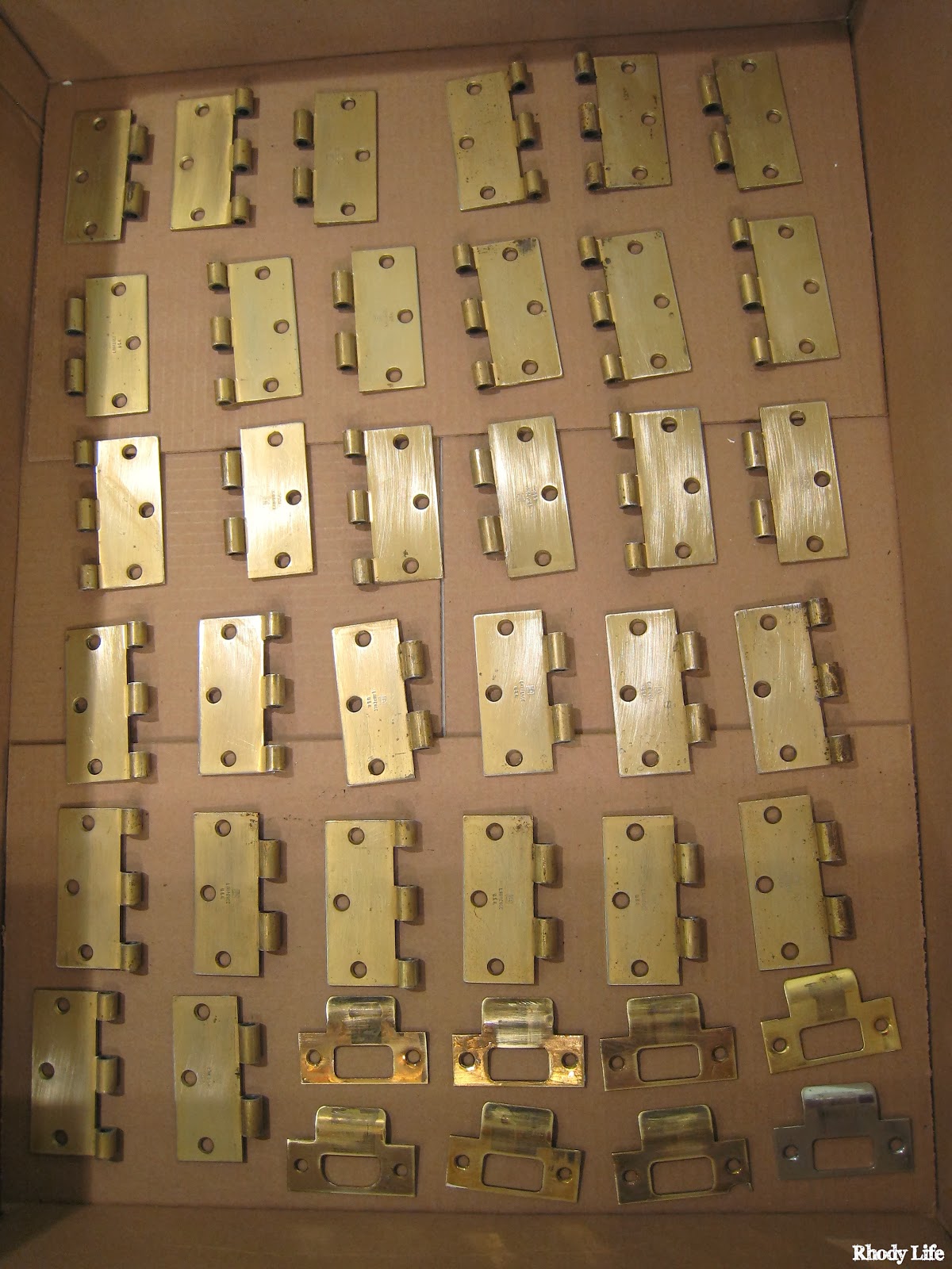 I'm pretty sure that the hardware hadn't been cleaned or even wiped down in years, so after I had everything taken off, I gave all the hinges, door pins, and door plates a much need bath to get all of the grease and paint off them. I ended up needing a razor blade to remove some of the paint, but I wasn't too worried about scratching the metal since I would be sanding them down before painting them.