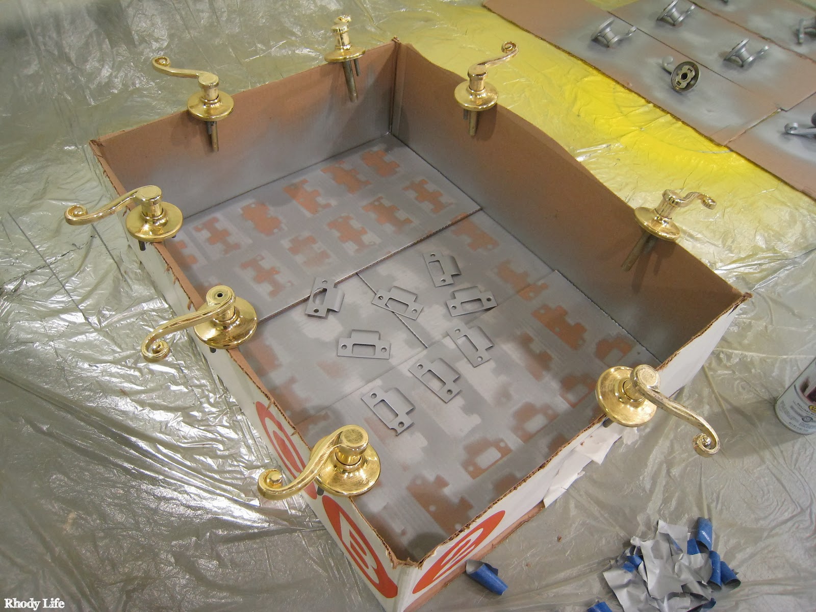 Painting your door handles is almost exactly the same as the door hinges. You'll want to roughen up the surface with some sandpaper and then apply a bunch of different coats of spray paint. You may need to flip your handles onto the sides or even hold them at different angles when painting them, depending on the shape and size, and where you need coverage. You can also tell in one of the pictures below that I was able to get creative and used the side of a cardboard box to prop one side of the door handles up so they could dry without putting a mark in the spray paint.
