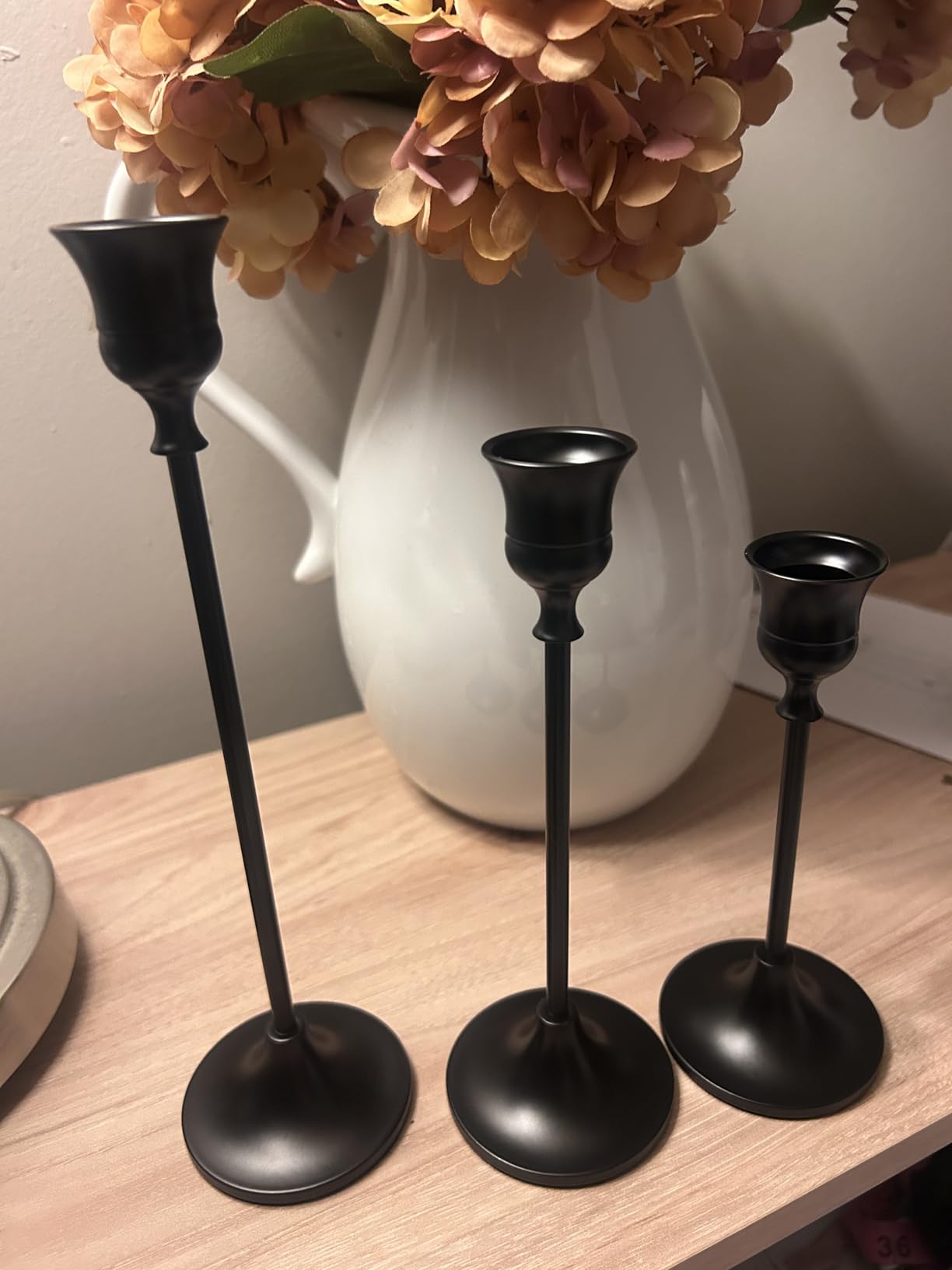 These candle holders look elegant and modern, with a smooth matte finish and solid weight so they don’t tip over easily. The three different heights create a nice decorative display and match well with neutral or farmhouse décor. Great quality for the price — they look much more expensive than they are. Highly recommend