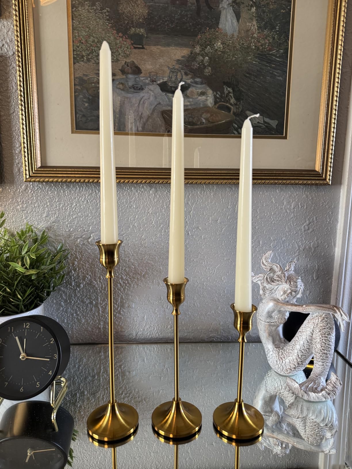 Reviewed in Canada on November 17, 2024The Candlestick Holders Taper Candle Holders Set is the perfect addition to my home décor. The brass gold finish gives them a luxurious, vintage-modern look that elevates any space. Whether on the mantel, dining table, or used as a centerpiece at a wedding, these holders add a touch of elegance to the room. The set of 3 offers variety in height, creating a beautiful visual balance. They’re sturdy and well-made, with a sleek design that complements both classic and contemporary styles. This set also makes an excellent housewarming or wedding gift. Highly recommend for adding sophistication to any setting!