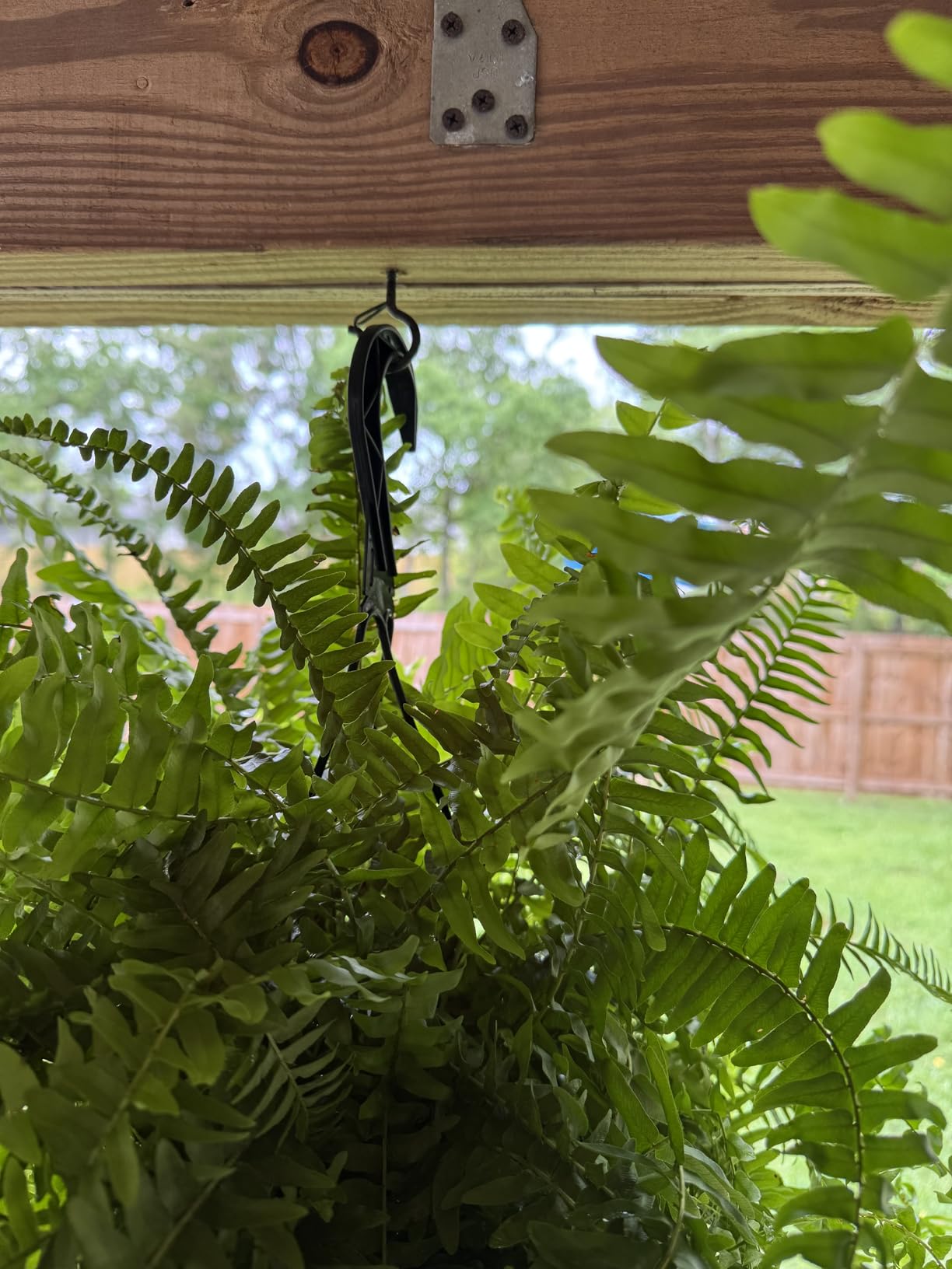 Long and short.....The 13 by 10 foot tent canopy we had on the deck was crushed by snow last winter. I left the canopy up, my bad. I saved the corner pieces and took a piece of scrap lumber that was laying around and made a " shelf" for my hanging plants and hummingbird feeders. It'll get me by until I build a permanent structure on the deck.