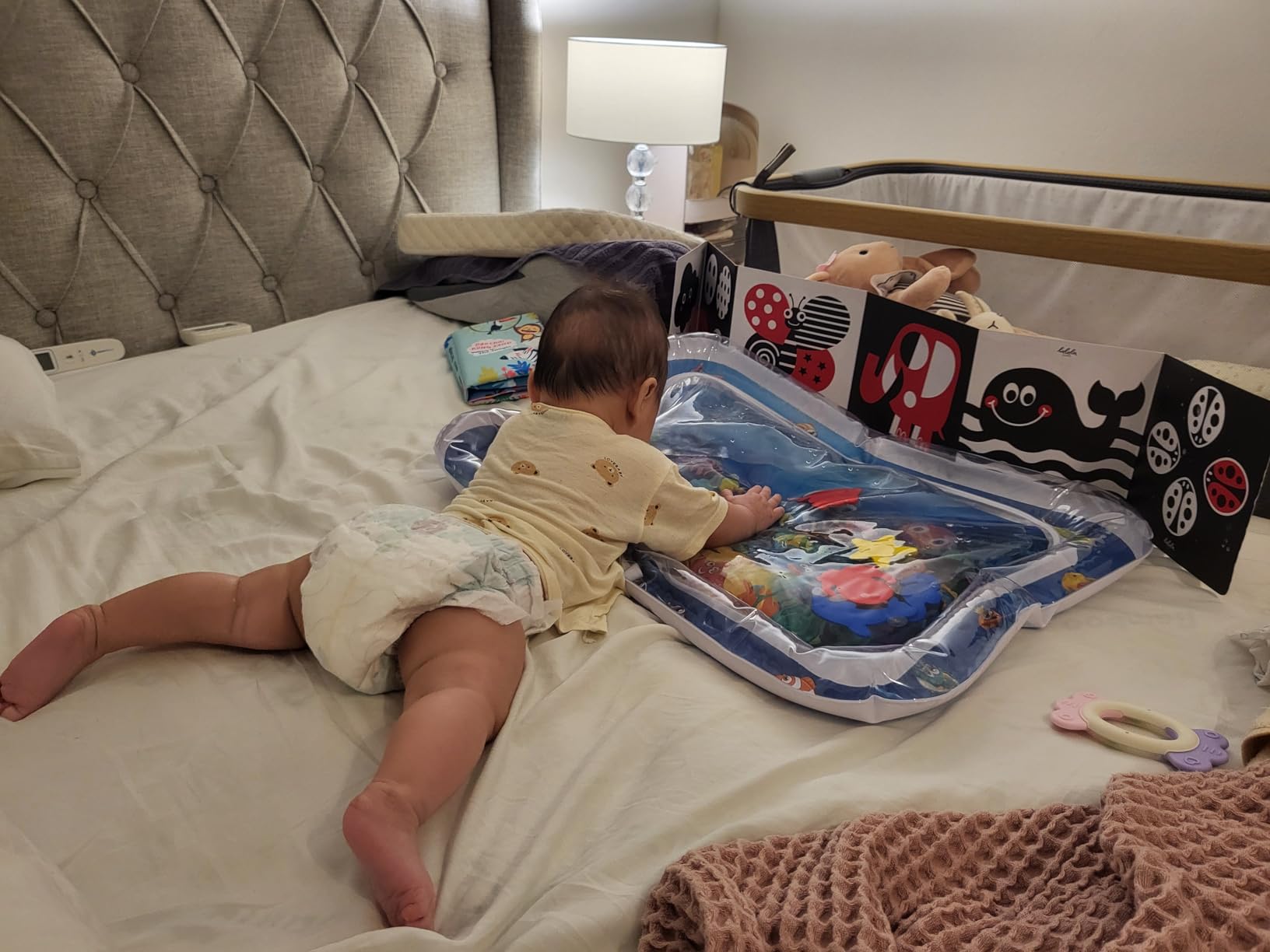 Reviewed in the United Kingdom on 10 March 2025My baby really enjoys playing with this mat. It’s large and easy to fill up. The main section you fill up using the tap and the edges are inflatable with air. Very little time to set it up and my little one appreciates using this not only as a toy for tummy time but also as a water mattress to roll onto and relax (for about two seconds but still) so nice and safe. No leaking, vivid and fun colours. Quality is good and feels sturdy.