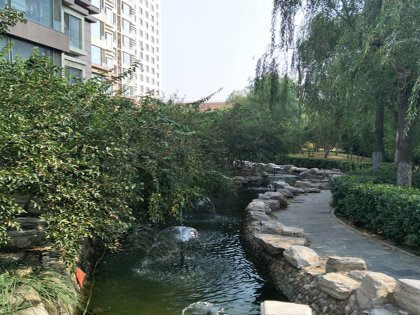 小区绿化率35%,假山,水系,喷泉,还有健身器材。