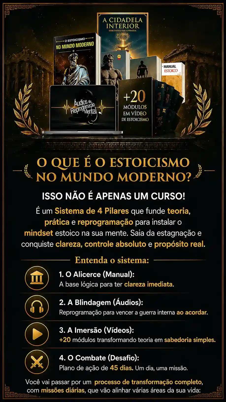 É um Sistema de 4 Pilares que funde teoria, prática e reprogramação para instalar o mindset estoico na sua mente. Saia da estagnação e conquiste clareza, controle absoluto e propósito real.