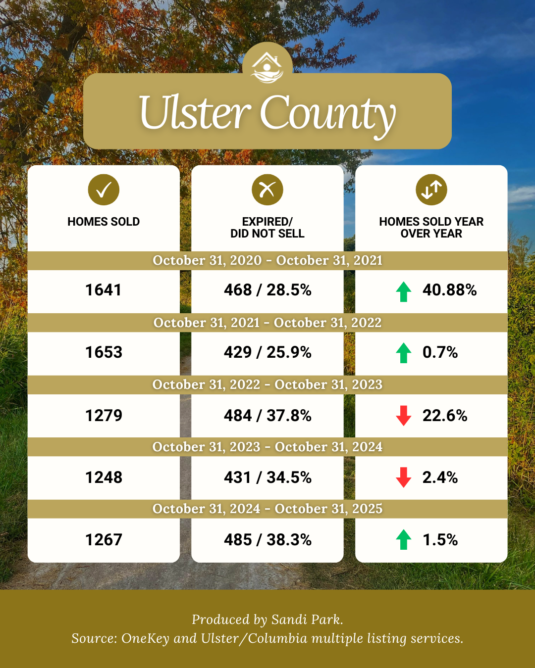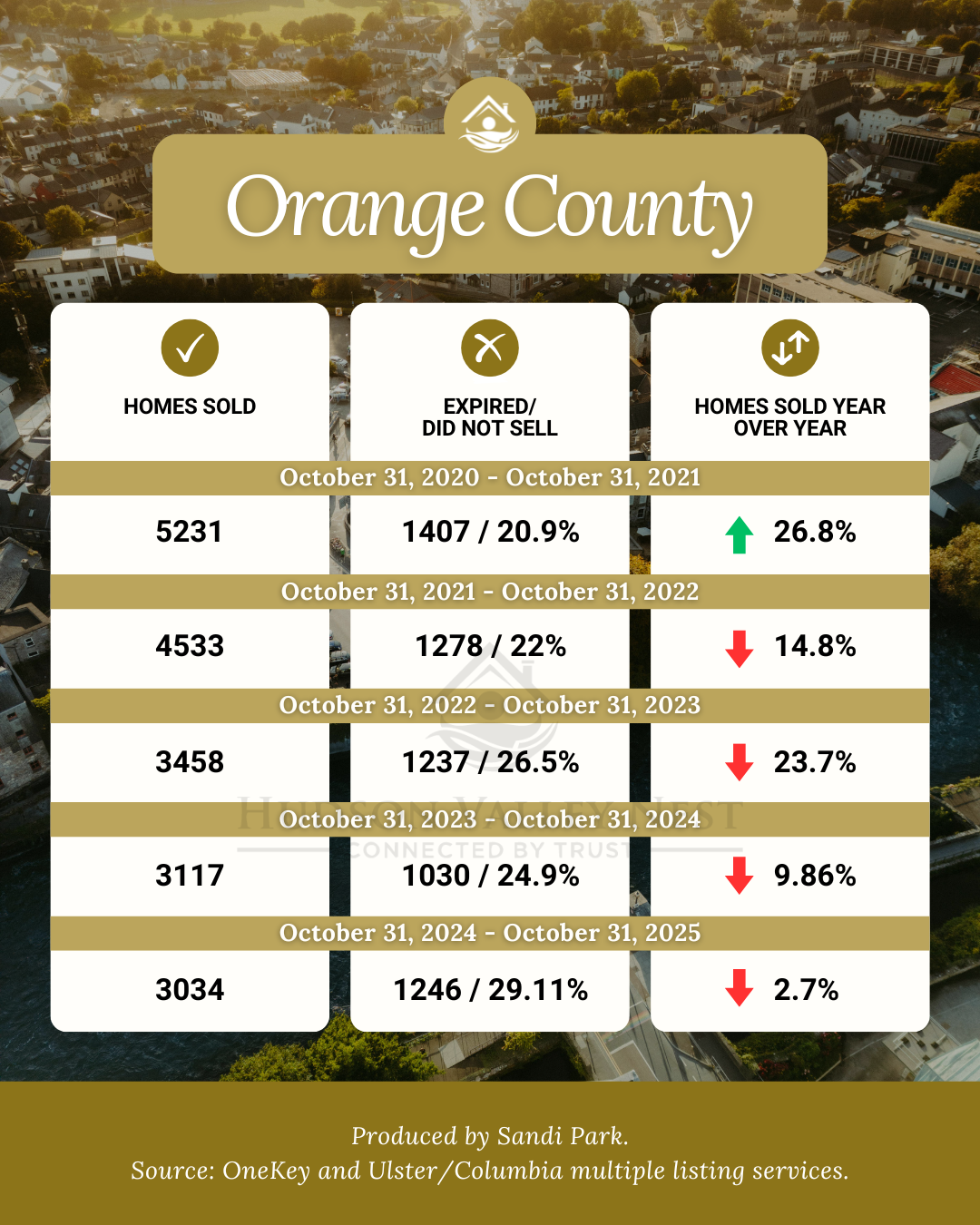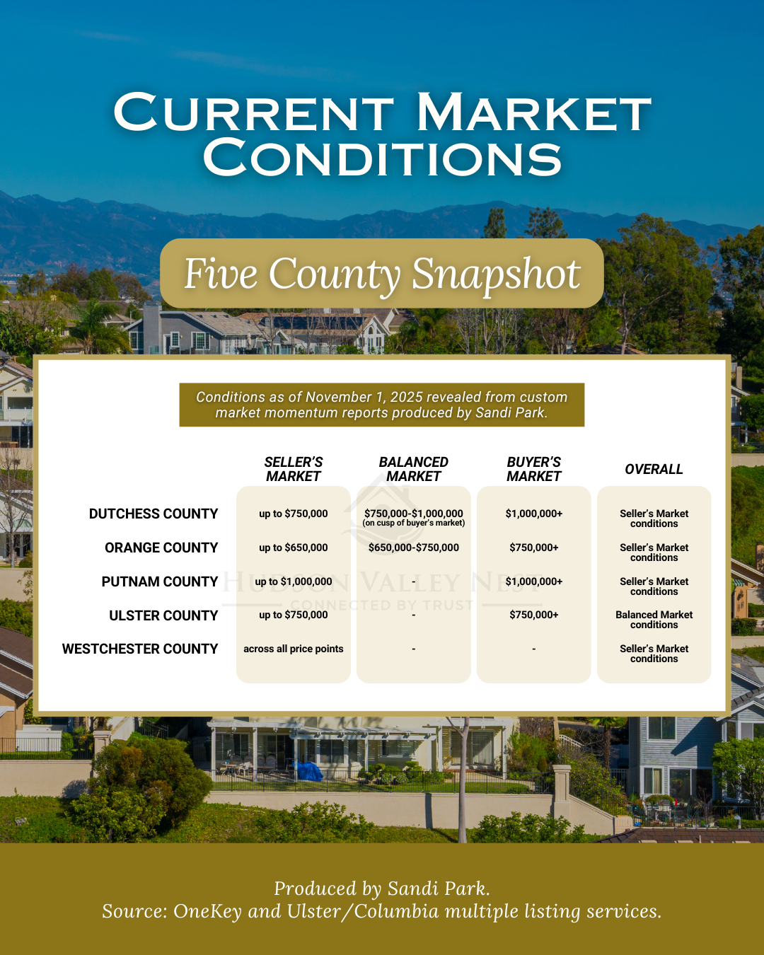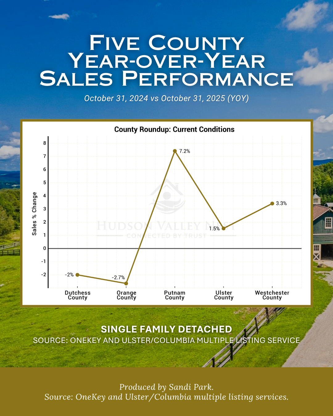 Of the five counties analyzed here, all are still in overall seller's market conditions with the exception of Ulster County, which is now an overall balanced market. Westchester, Putnam and Ulster County have all increased in sales with Dutchess and Orange realizing a decrease October 31, 2024 vs. October 31, 2025 YOY.