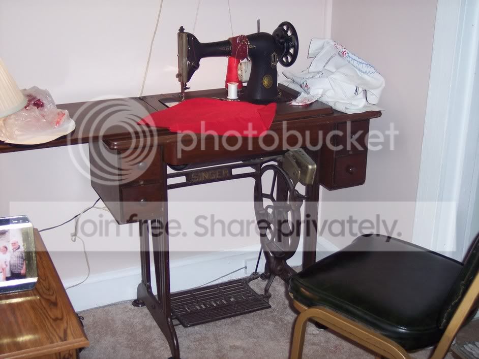 1953 Singer Sewing Machine This belongs to my Grandmother. But I use it more than anyone else ... even her. She's promised to leave it to me. As you can see, it has knee & foot peddle mechanisms to work it.