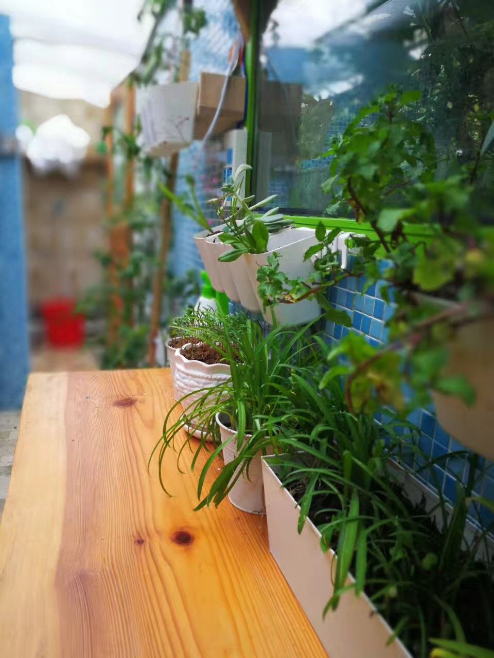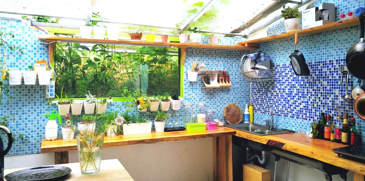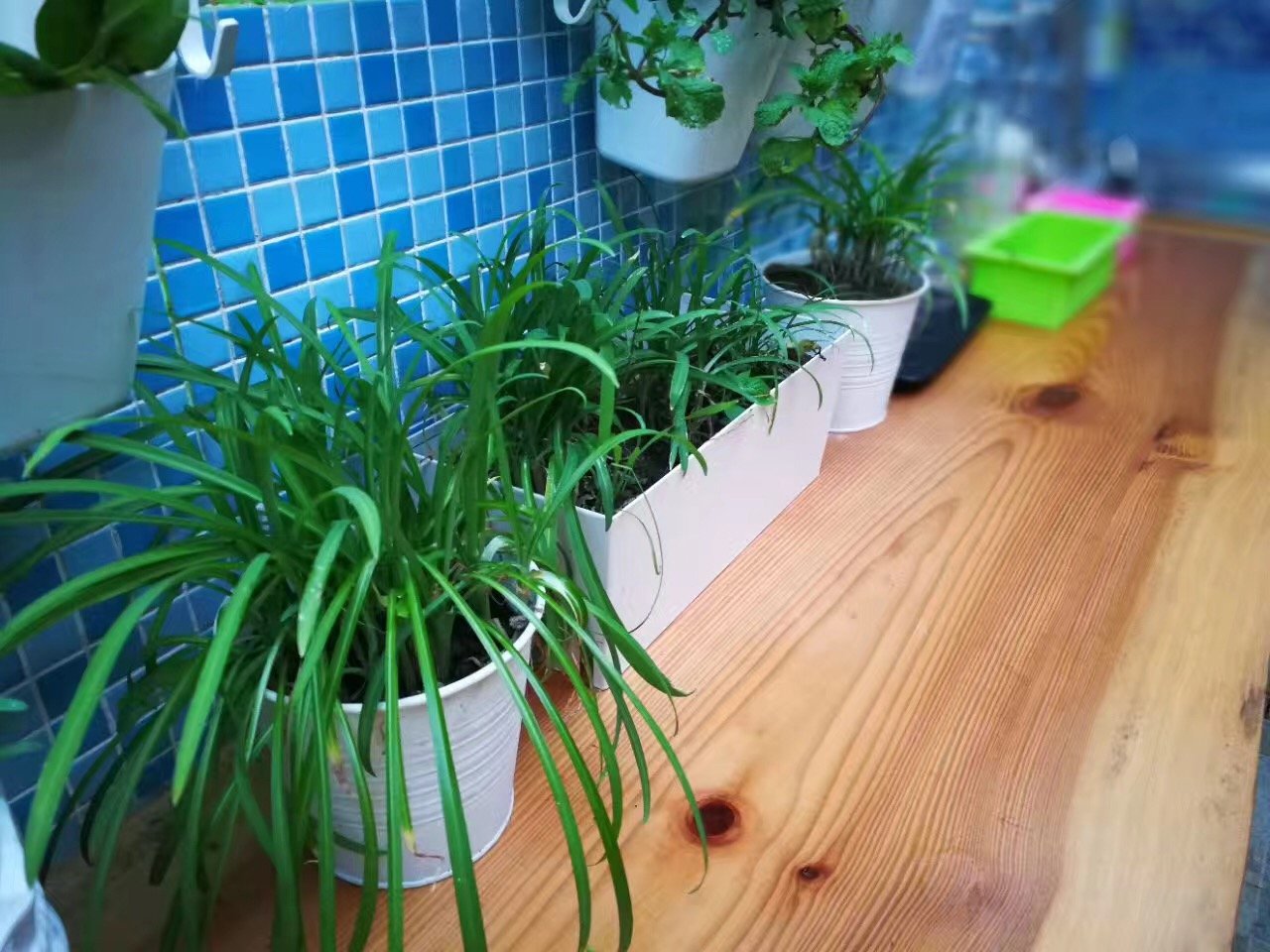 厨房的灶台已看不出原来的模样,一缕缕阳光透过屋顶照进来,屋内种的的韭菜、番茄、黄瓜、薄荷显得格外兴奋,美滋滋的沐浴着暖暖的阳光充满生机。高温天气在这样的厨房里做饭,整个人都凉爽起来了。