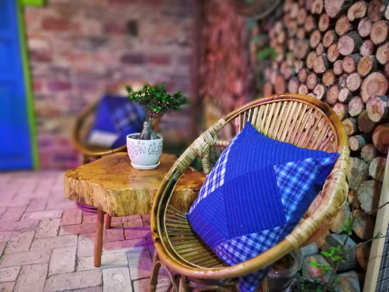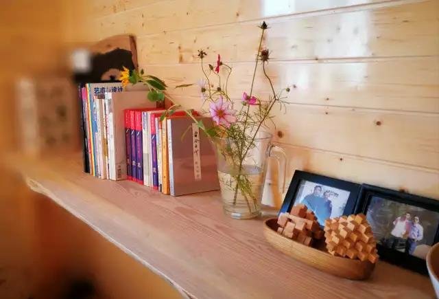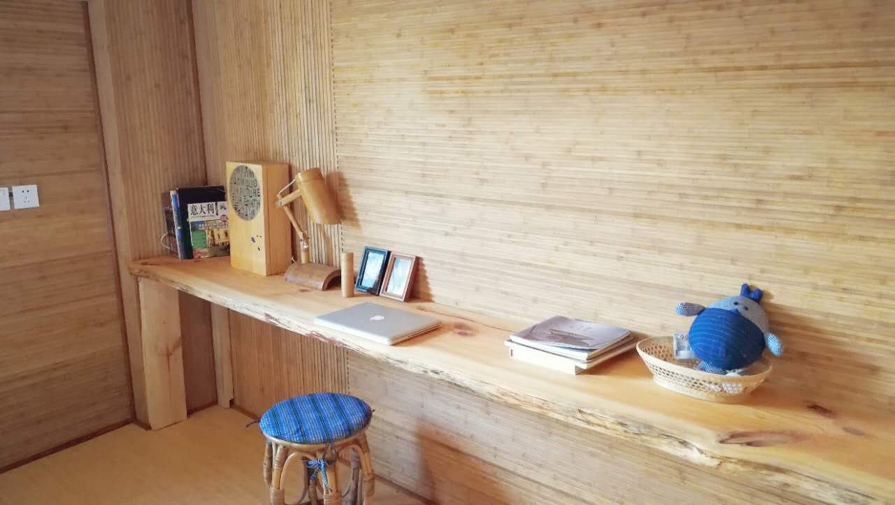 大厅尽可能多保留了原来的建筑风格:几十年的老木门和旧地板,以及各种旧门板切割的文化墙。竹本木南先生亲手打造的老树桩年轮茶几,中西合璧的设计风格 ,相得益彰。简约的实木搭建,简单而实用,桌上的绿树植物错落有致的排放着,屋里绿意盎然,充满生机。