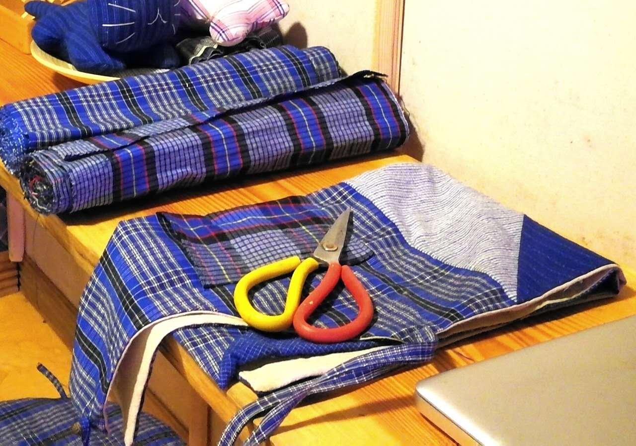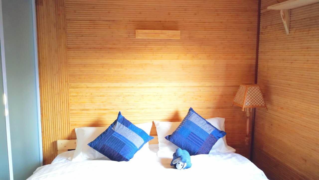 布房不大,但摆放合理,印花蓝土布被铺在实木床上,让人赏心悦目,很想好好睡一觉。