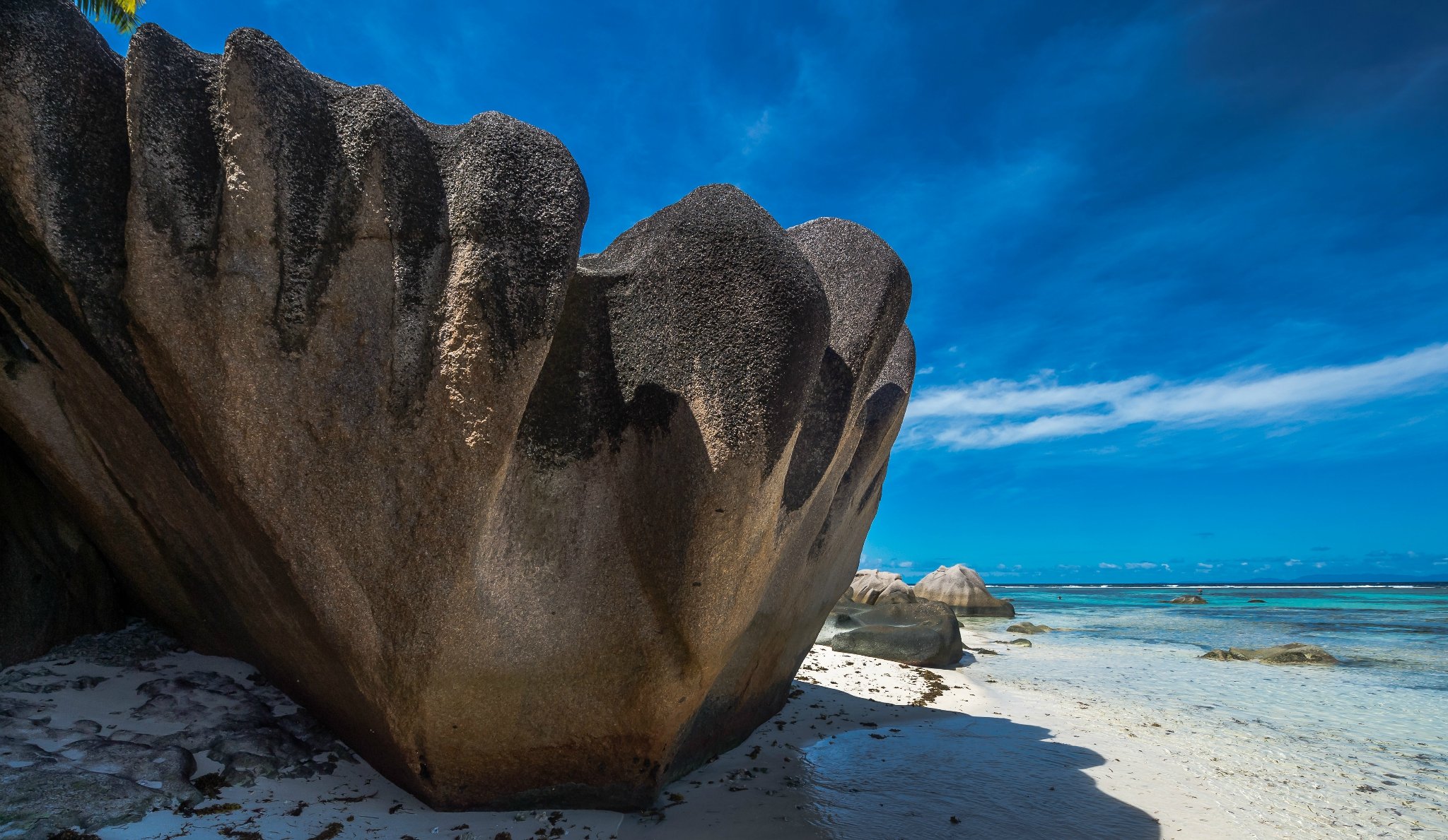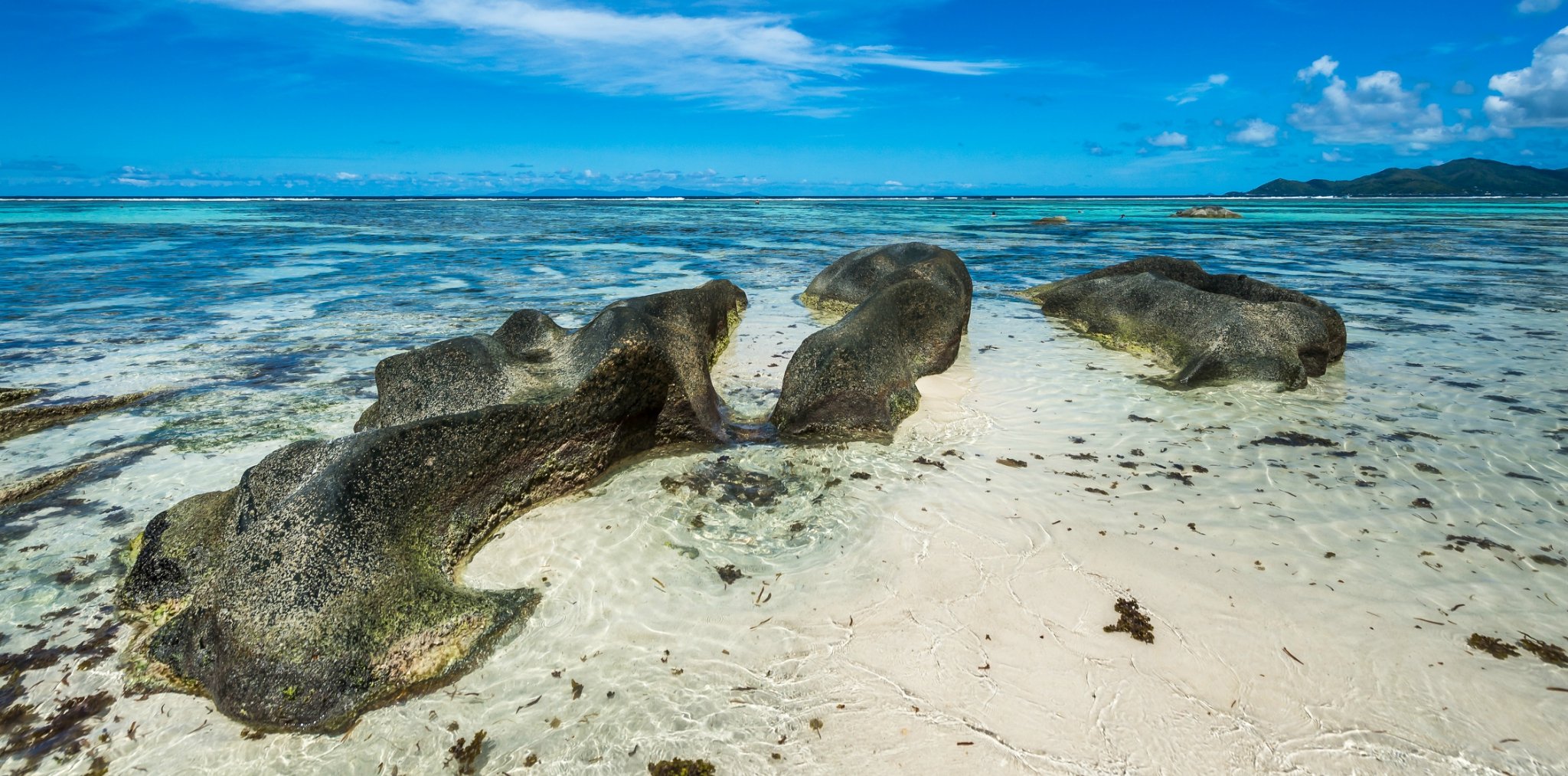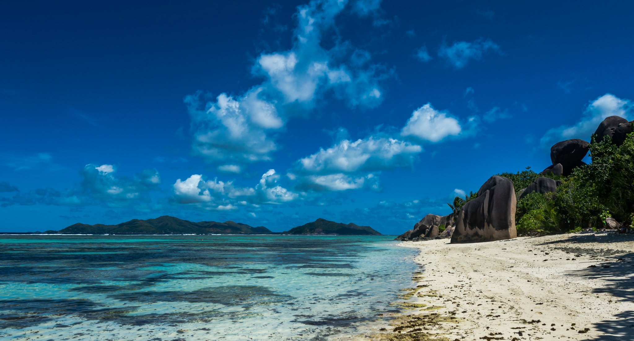德阿让沙滩曾多次被美国国家地理杂志评选为世界十大最美沙滩之首,那里的沙滩细如面粉,那里的海水透如宝石,并且呈现不一样的透亮色彩,在阳光和沙石的配合下,海水呈现出了暗黄、褐色、淡绿、果动绿、湛蓝、深蓝六种颜色。场景美轮美奂,值得一览。风浪小的地方适合浮潜,定能给你留下深刻的度假感受!如果两个人牵手承包整个沙滩,一起看海也会十分浪漫哦。