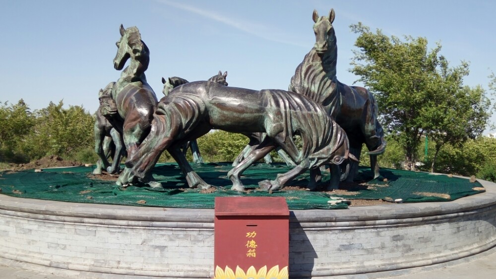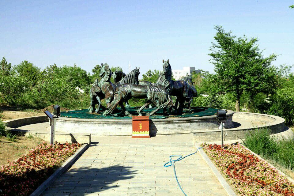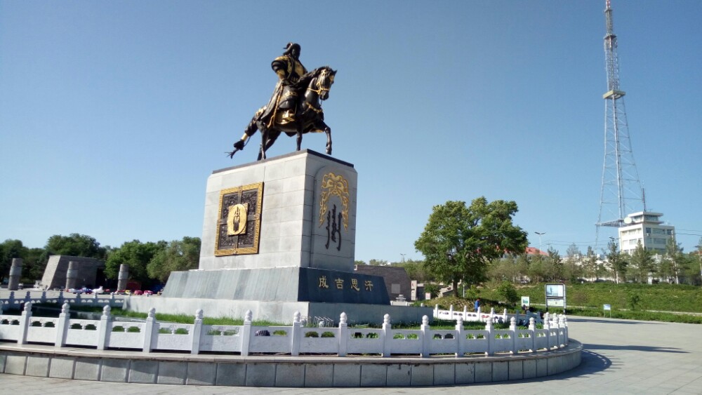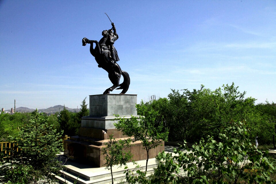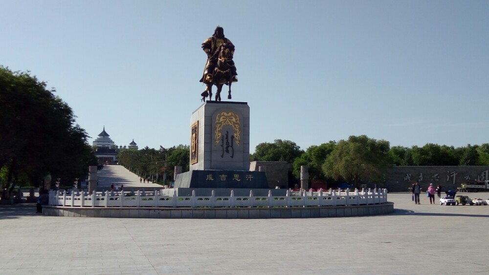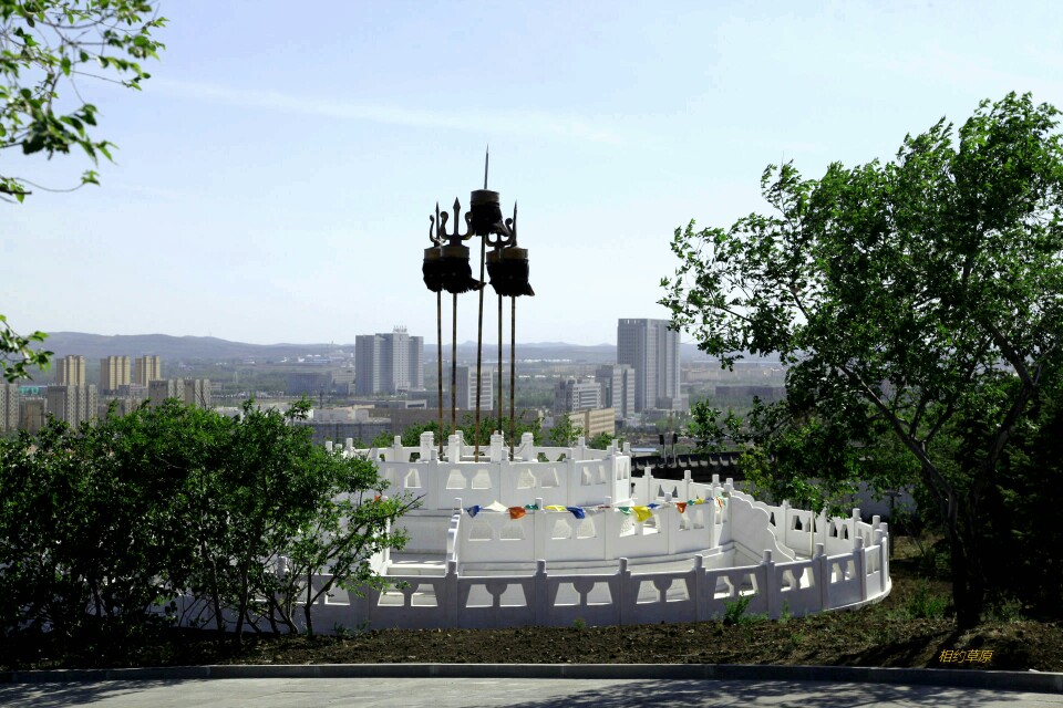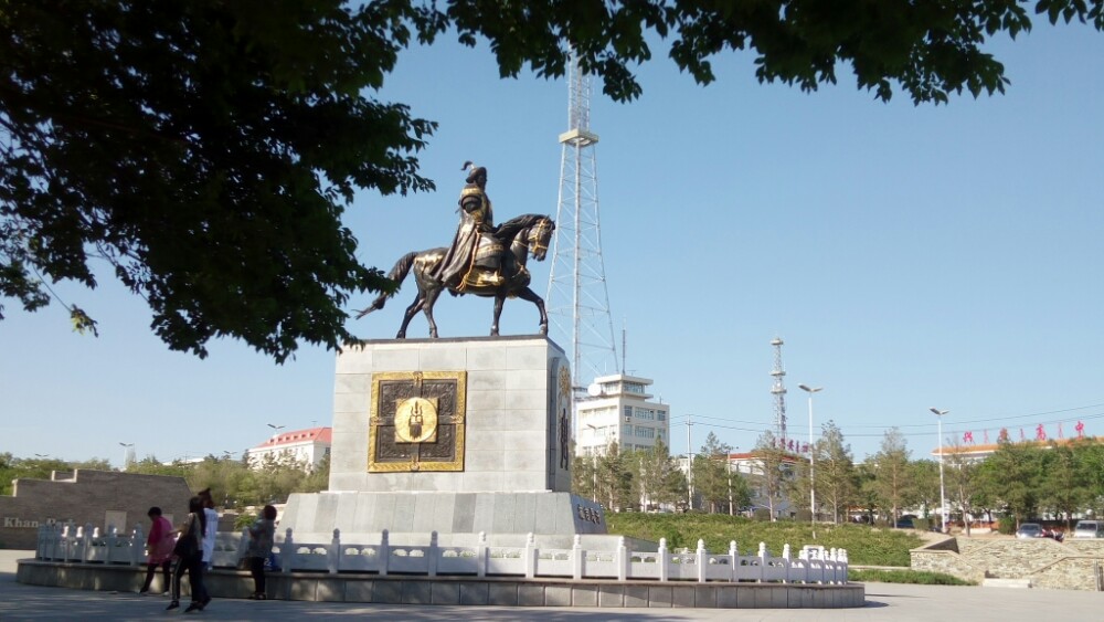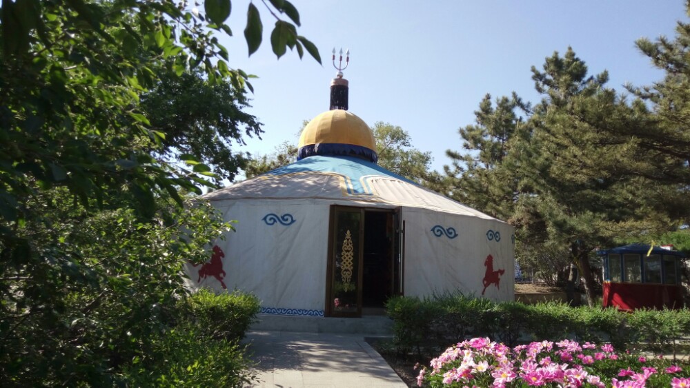 火辣辣的太阳已西斜大半,直刺额头,烘烤着行人。我们原路返回进出口,顺便进了金顶蒙古包看了看后,顺着山路来到了和“成吉思汗庙”连为一体的乌兰浩特市“五一广场”。