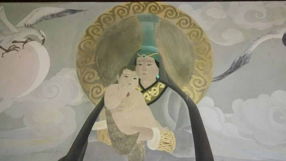 成吉思汗母亲怀抱婴儿壁画 殿内墙壁上绘有10多幅大型壁画,描绘出成吉思汗不平凡的一生。