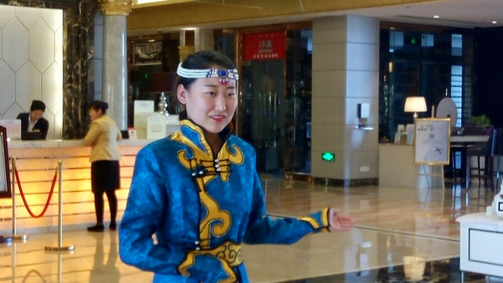 美女蒙古族服务员面带微笑礼仪迎接客户