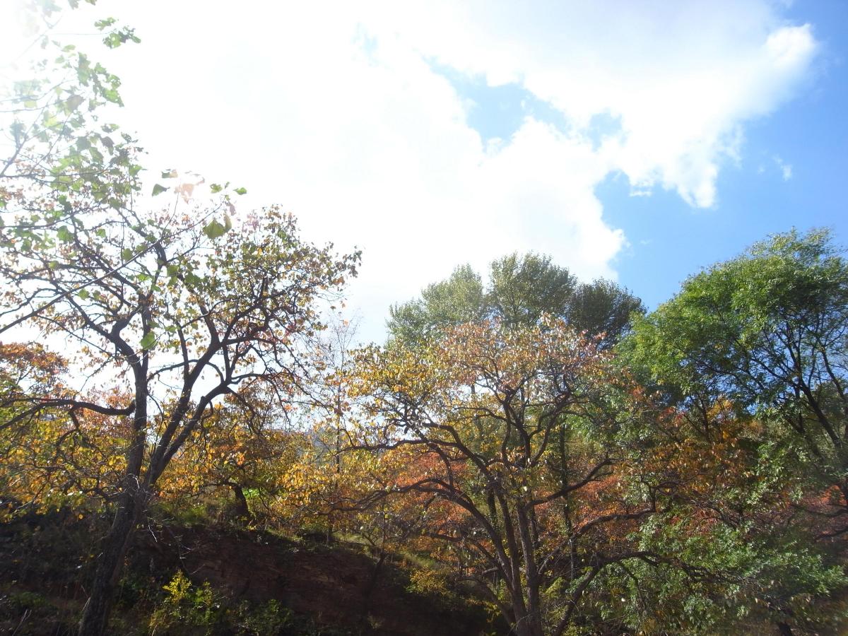 几十分钟后。罗姐寨风景区叉路口,车把我们停下。属于北方干燥的明朗气息朝我们扑过来。盛大而浓烈。和姐姐很强势地不愿意上一辆还不了价还异常拽的臭男人的车。结果等了半天,还是以和那臭男人开的价一样的价钱(60rmb)上了罗姐寨。山很陡,车子在山上沿路绕来绕去,转得我们又兴奋又头晕。第一次见着这样的路,我们一会儿看看碧绿山野上夹着的那一片片金黄和火红唏嘘感叹,一会儿又对司机师傅问东问西。师傅人很好,认真开车,并没有被我们的不礼貌弄得分了心。下车的时候还给我们手机号码,说有需要可以找他。赞一个给师傅。