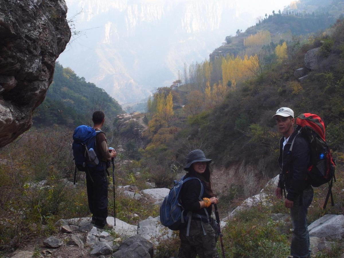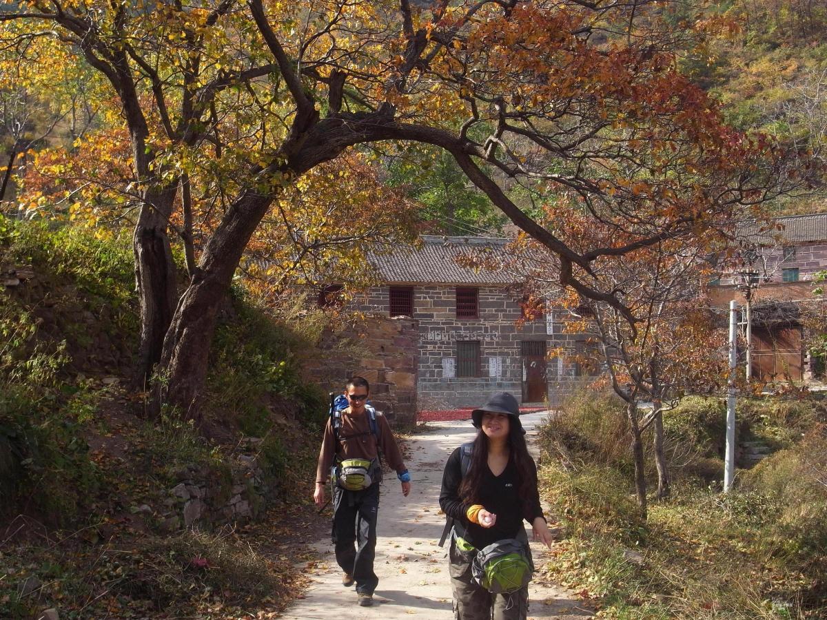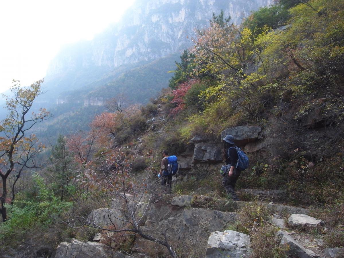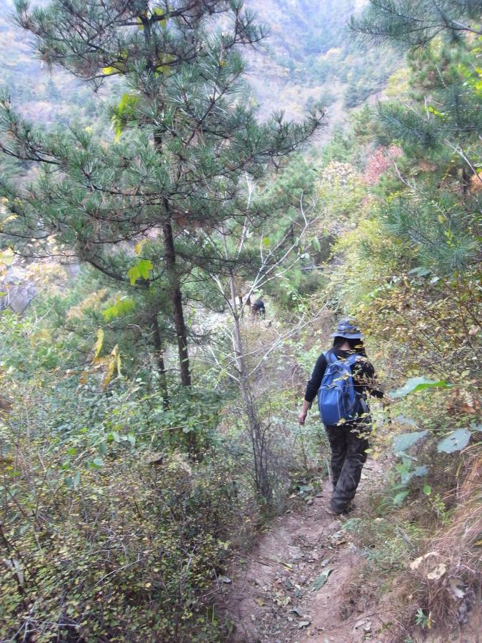 岔路上作别大娘,有难度的路这才开始,只能容下双脚的下坡路面。这时候真的很希望自己再重一些,背上的负荷再沉一些,我就不用那么拼命地让中心向后了。感谢苍狼同学在身后不时拉住我,感谢我的童鞋防滑作用不至于太差。只是更让我们担心的是草姐姐的脚,暑假那一伤至今仍有后作力,真是为难她了。看她拄着杖,缓慢却坚定地朝前进,仍旧不忘提醒我们路况。蚂蚁也不放慢速度回望我们。还有什么比团结的力量和对伤痛的漠视更鼓舞人心呢?松针路,落叶林路,碎石路,原来这些可以这样另人欢喜。当你面对一大座岩石,看不见路看不见岩石下面是深渊还是城堡,四顾没有村庄没有人家,你是否绝望?但当你真的走在满眼秋色浓郁的山间,当你穿越了几座山岗,当你心里怀着一个美好目的地的时候,你也会和我们一样吧。更多喜悦和兴奋在胸腔燃烧,火红的激情像那山楂树般,在静静的山中叫喊、喧嚣。他们说:“这是最美的郭亮,没有任何信息任何文字任何图片是关于郭亮的秋天的。我们是最幸运的。”是啊,谁说不是呢?我们又何止幸运,我们还多么幸福。四个互不相识的人,因为不同的原因有了这个相伴的旅程。我们在一起,领略了如此令人迷醉的秋日里的“艳遇”。