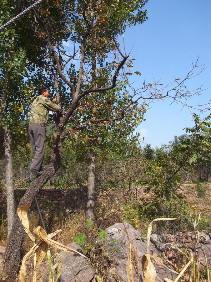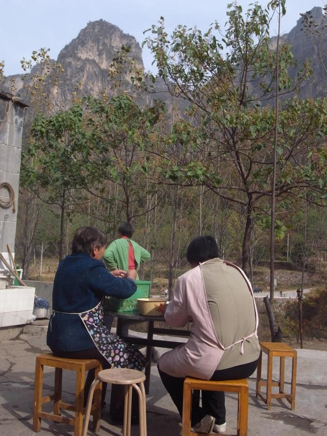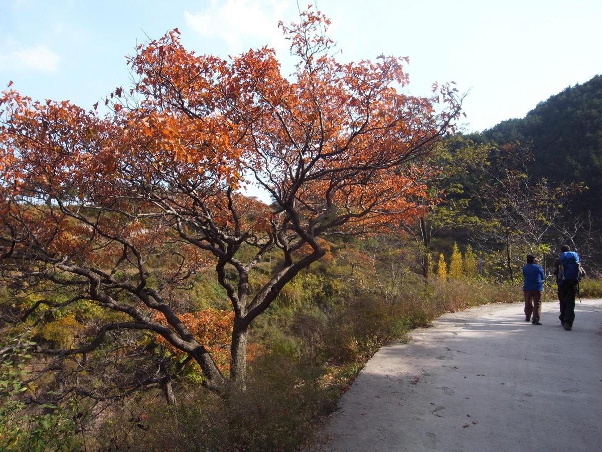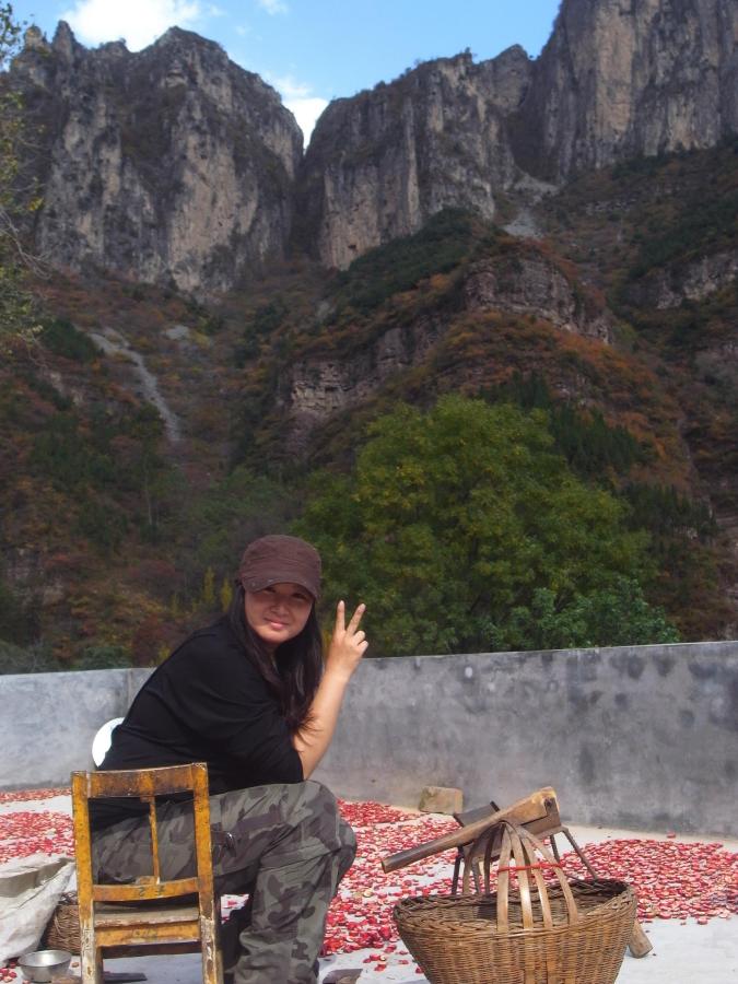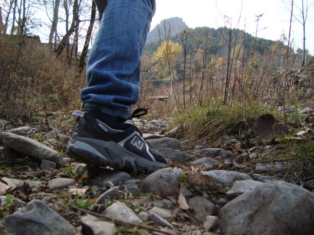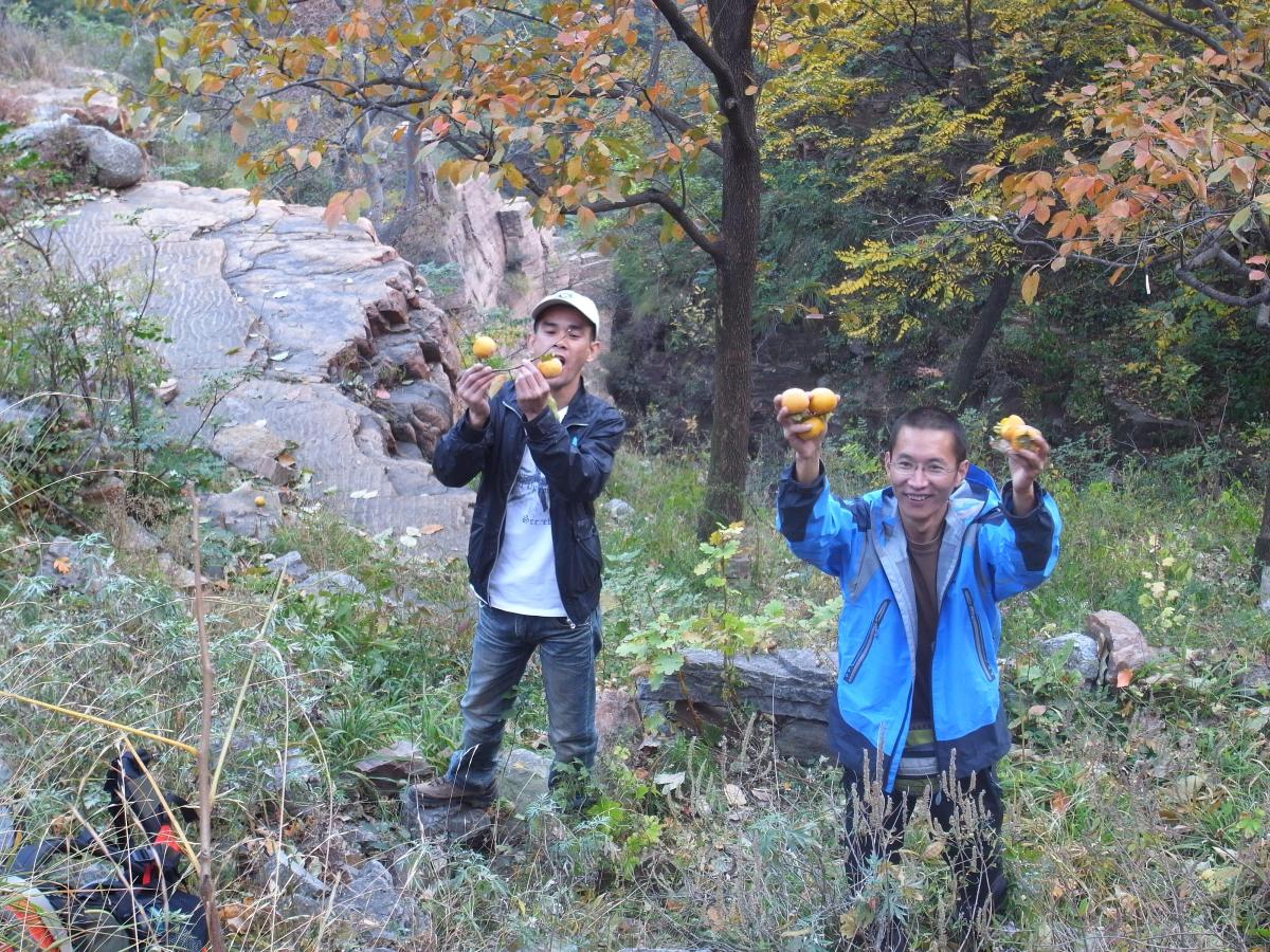 岔路上作别大娘,有难度的路这才开始,只能容下双脚的下坡路面。这时候真的很希望自己再重一些,背上的负荷再沉一些,我就不用那么拼命地让中心向后了。感谢苍狼同学在身后不时拉住我,感谢我的童鞋防滑作用不至于太差。只是更让我们担心的是草姐姐的脚,暑假那一伤至今仍有后作力,真是为难她了。看她拄着杖,缓慢却坚定地朝前进,仍旧不忘提醒我们路况。蚂蚁也不放慢速度回望我们。还有什么比团结的力量和对伤痛的漠视更鼓舞人心呢?松针路,落叶林路,碎石路,原来这些可以这样另人欢喜。当你面对一大座岩石,看不见路看不见岩石下面是深渊还是城堡,四顾没有村庄没有人家,你是否绝望?但当你真的走在满眼秋色浓郁的山间,当你穿越了几座山岗,当你心里怀着一个美好目的地的时候,你也会和我们一样吧。更多喜悦和兴奋在胸腔燃烧,火红的激情像那山楂树般,在静静的山中叫喊、喧嚣。他们说:“这是最美的郭亮,没有任何信息任何文字任何图片是关于郭亮的秋天的。我们是最幸运的。”是啊,谁说不是呢?我们又何止幸运,我们还多么幸福。四个互不相识的人,因为不同的原因有了这个相伴的旅程。我们在一起,领略了如此令人迷醉的秋日里的“艳遇”。