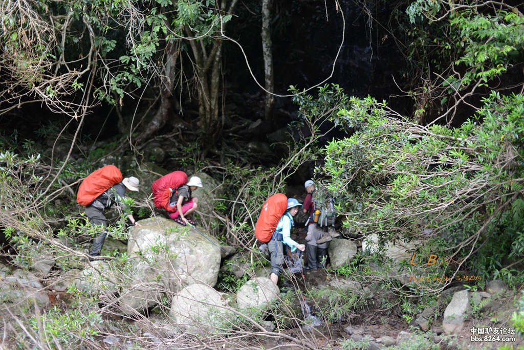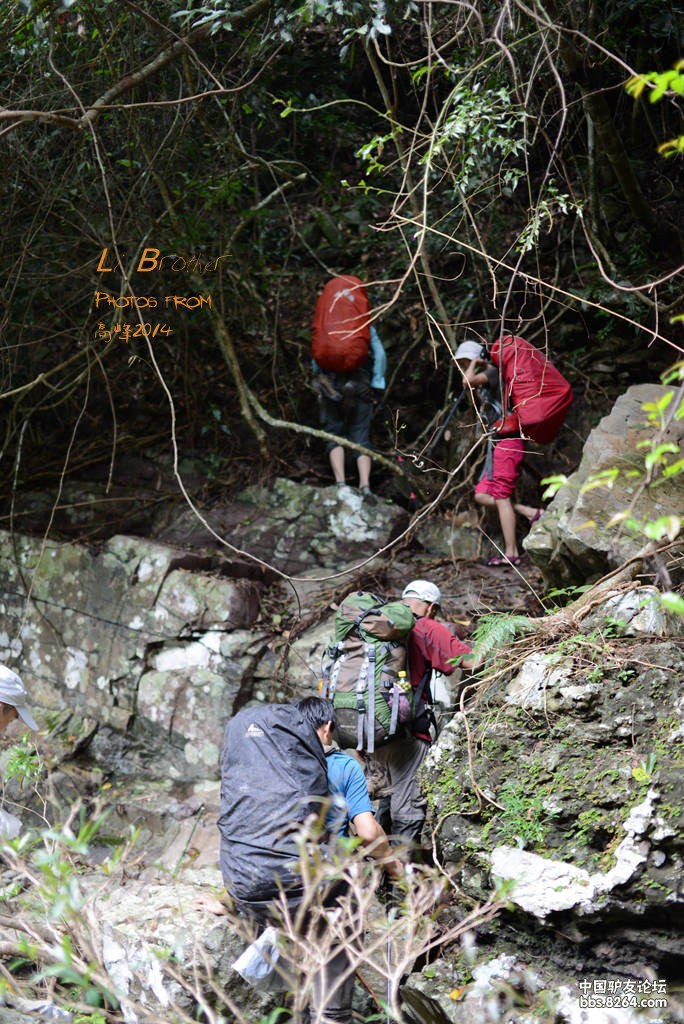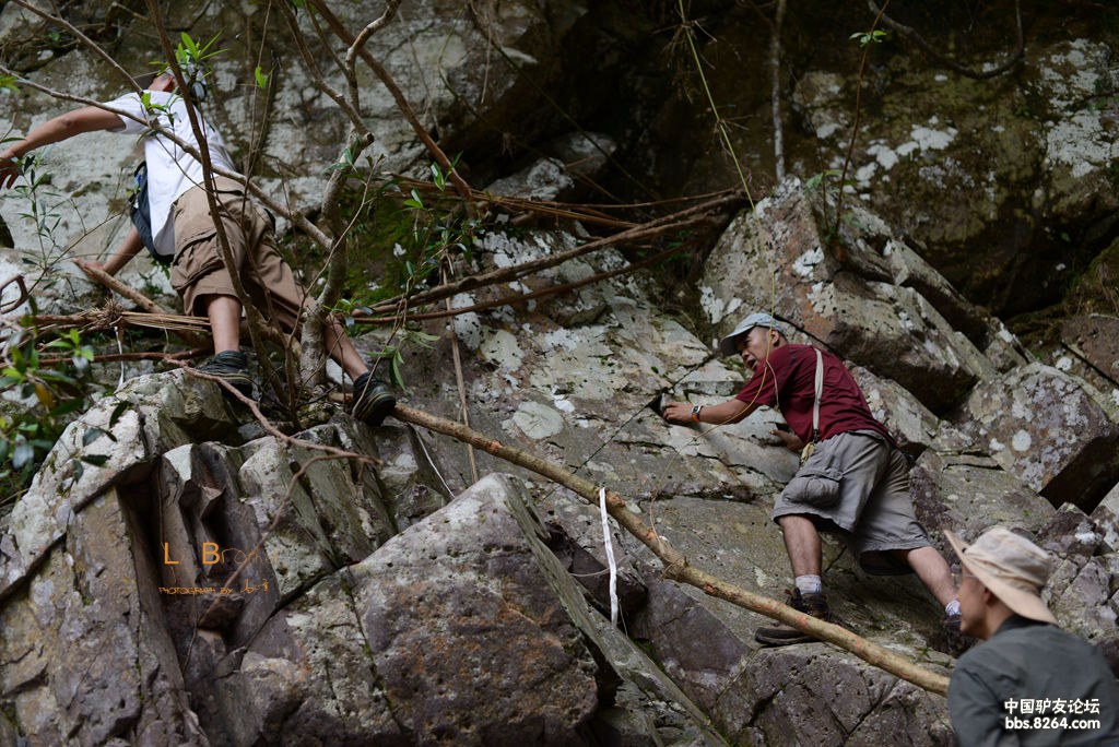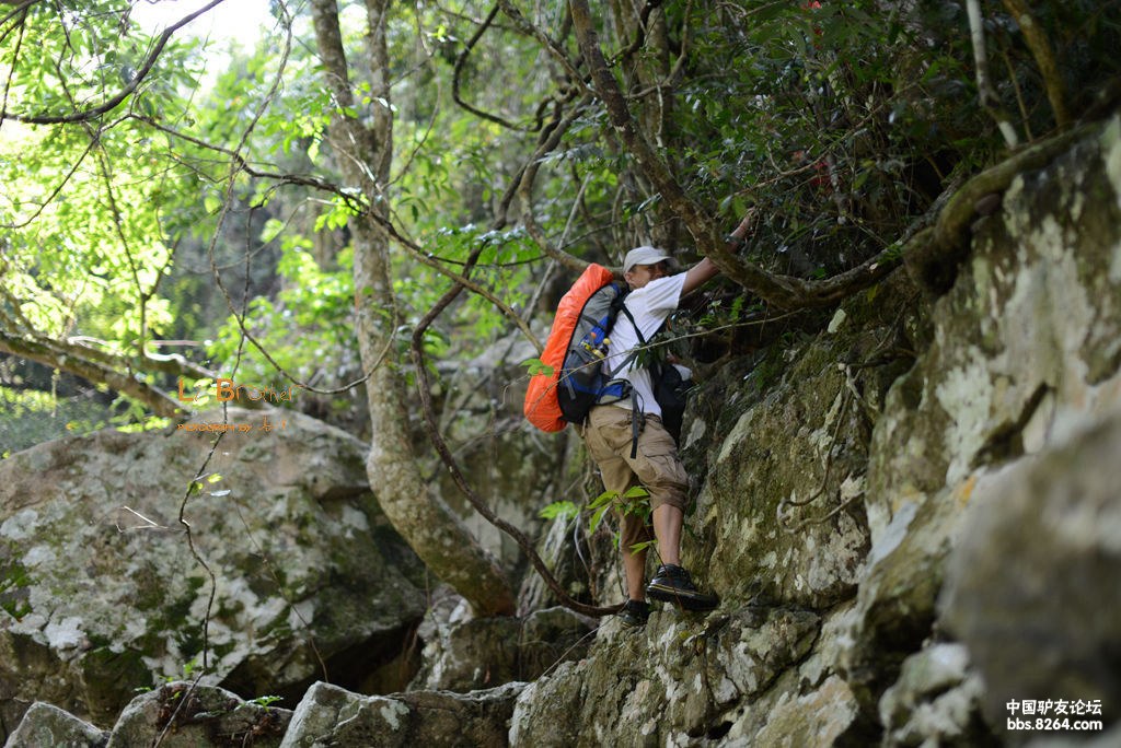 又一悬崖挡道最后上绳带,把背包一个个往上接送,最后徒手攀岩