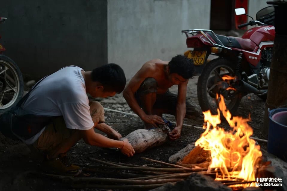 如夜,在桐才村改善生活中 <br> 感谢黎族村民阿聪 <br> 放养2年才长了18斤肉的五脚猪 <br> 火烤腿毛这一绝活更保证了肉质的野性