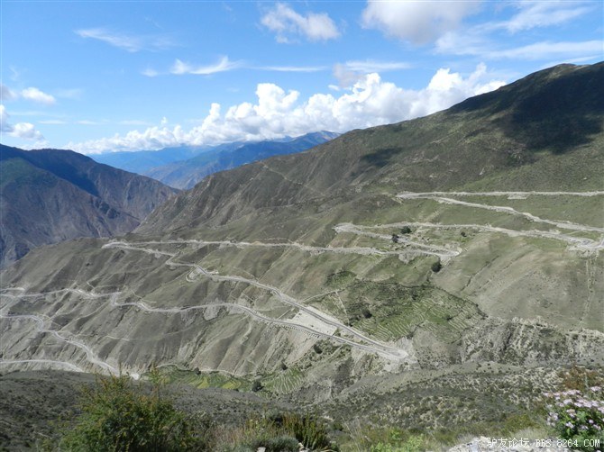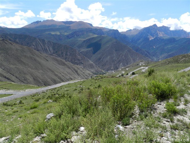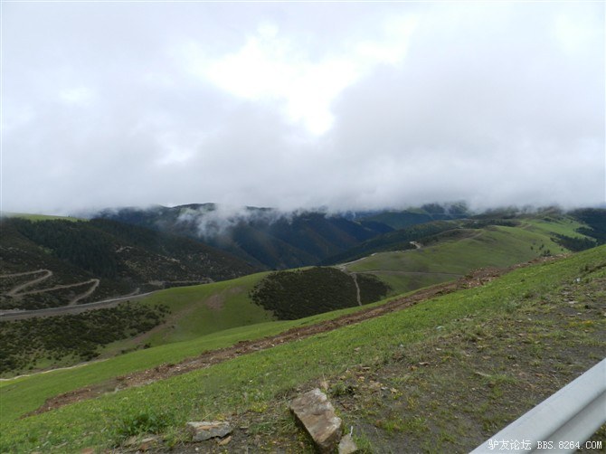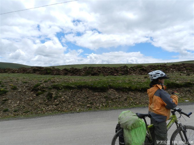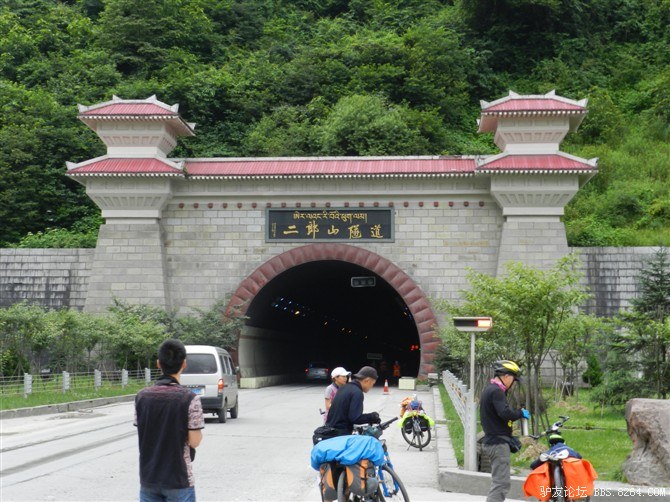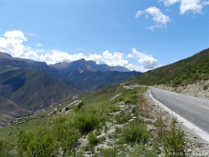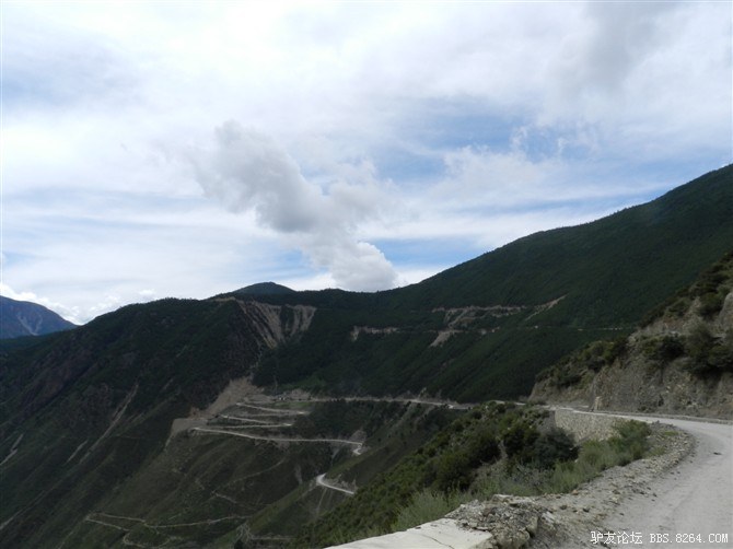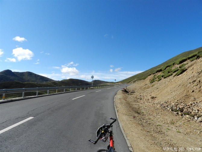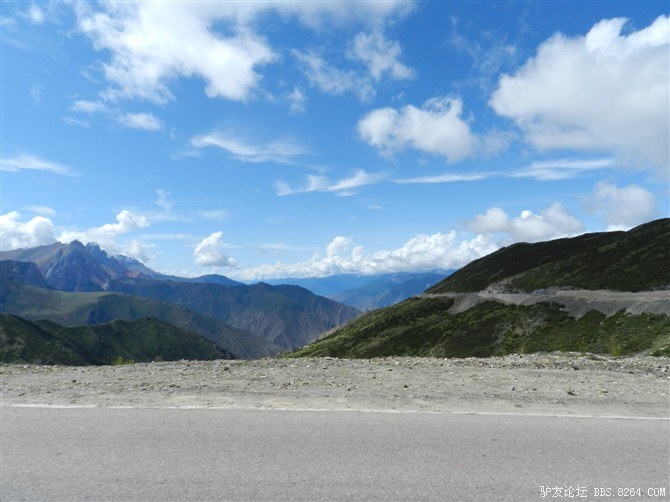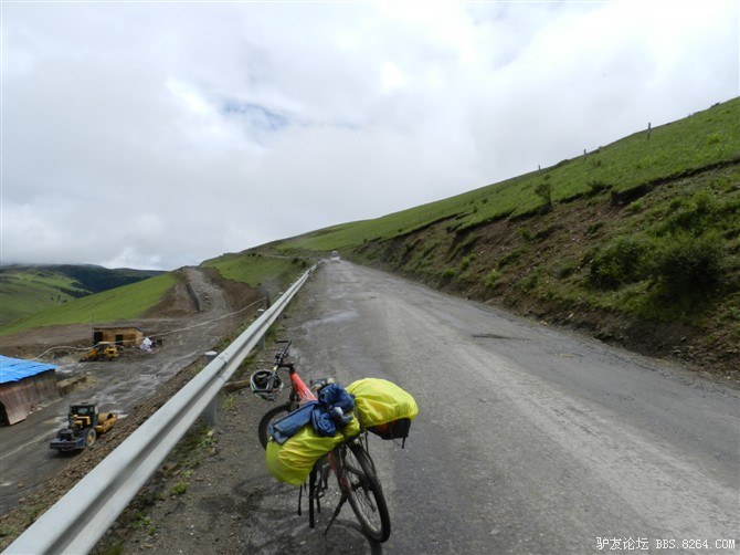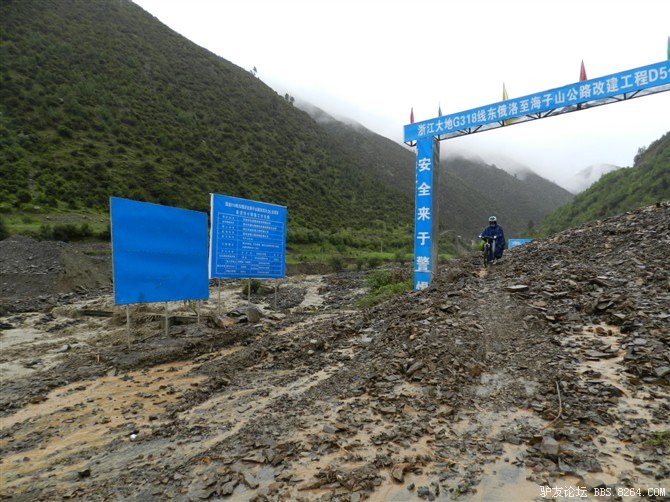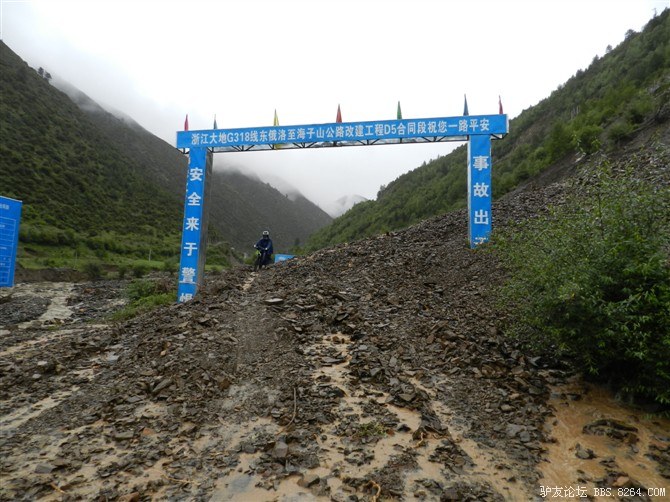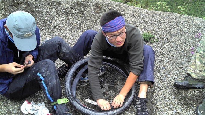 过了这处水毁路,又走过了一段塌方区,感觉还算轻松。终于骑上了好路,我们乐观的以为爬上高尔寺山就可以一路下坡放到雅江了,大家斗志满满的向前冲,却不知道真正的考验还在后面。后来想过,其实我们可以和其他骑友一起在新都桥等待路面抢修完后再走的,但是我们就是坐不住,拉萨就在不远的前方,我们忍受不了这种计划被打乱的情况。所以我们继续往前冲,我们需要的是挑战,是激情,是在实现梦想的途中不断超越自己的勇气。刚走了一段好路,小胡的胎就爆了。慢消气,换了2次,后来才检查出是外胎上扎了跟几乎看不见的小铁丝。我们的新胎都给他换上了,看来让晚上有事儿做了。要补3条胎。哈哈~