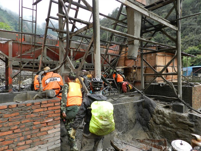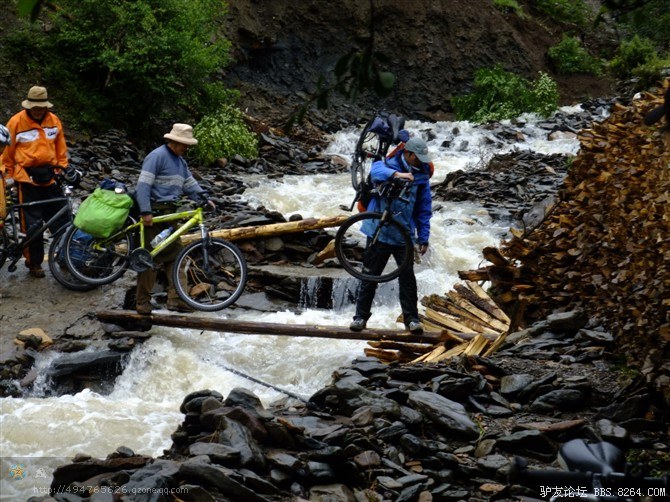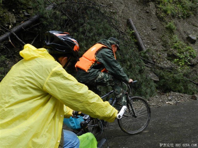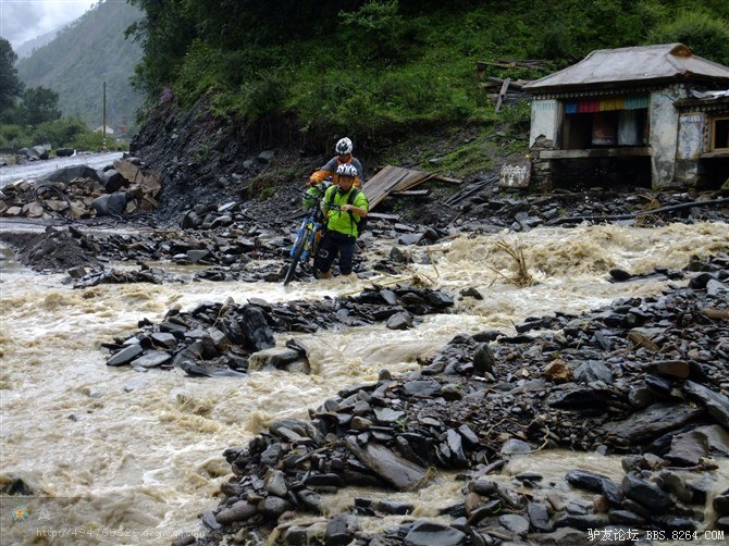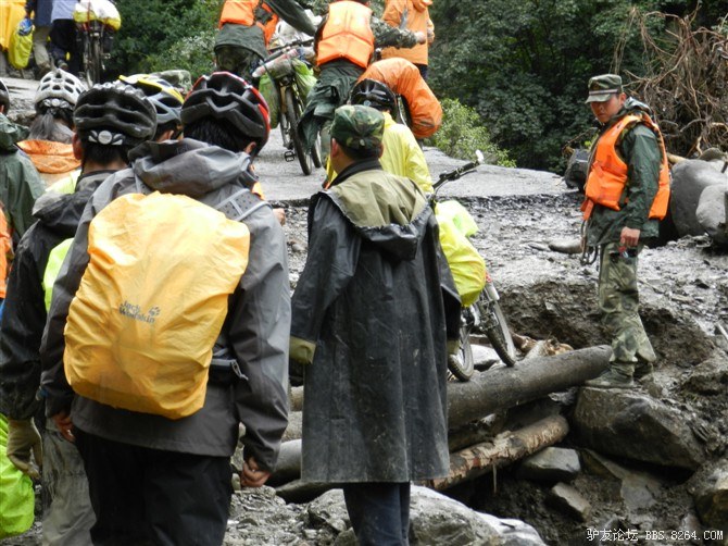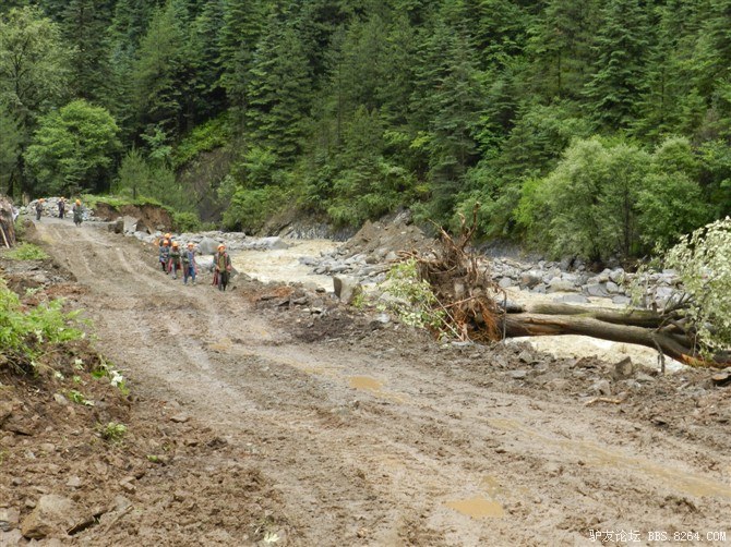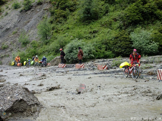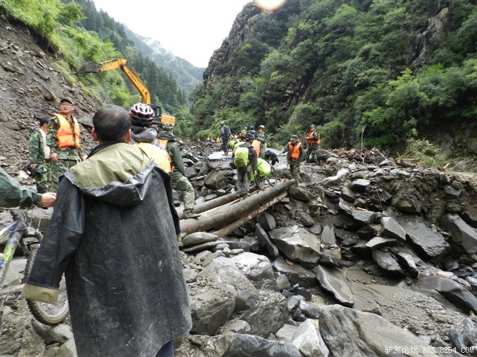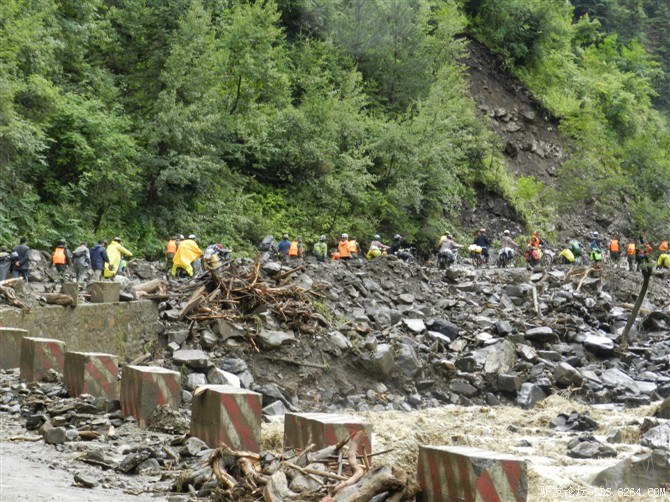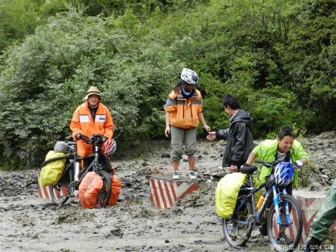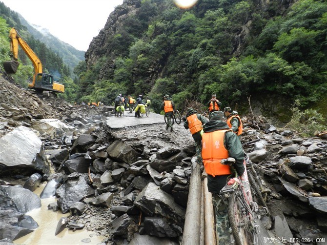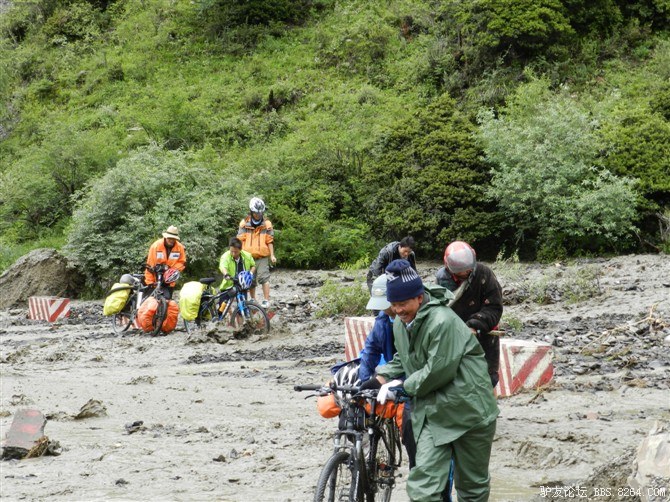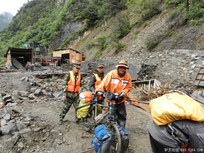 在解放军哥哥们用钢丝,圆木抢修好路面(机动车还是过不了),我们已经准备过去了。看见戚剑还停在原地犹豫着,我不知道我是哪来的信心,说了句,走吧,反正要向前走,和我们一起吧。 <br> 然后独身从北京出发的戚剑哥哥也加入了我们的队伍。
