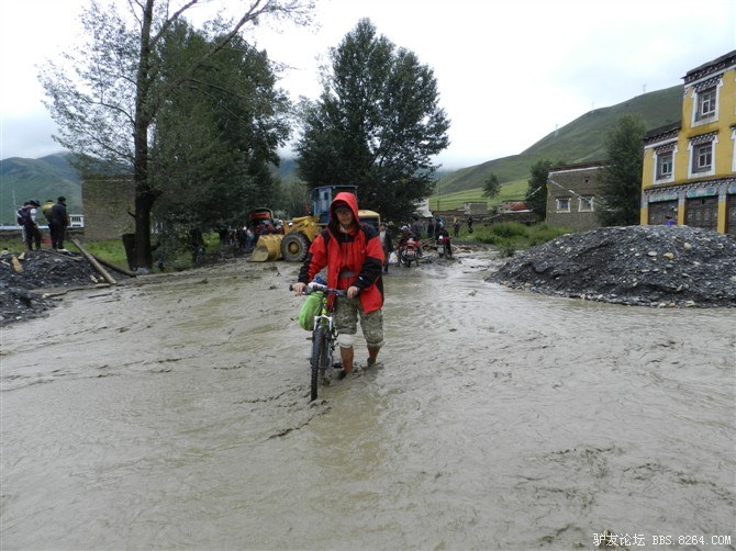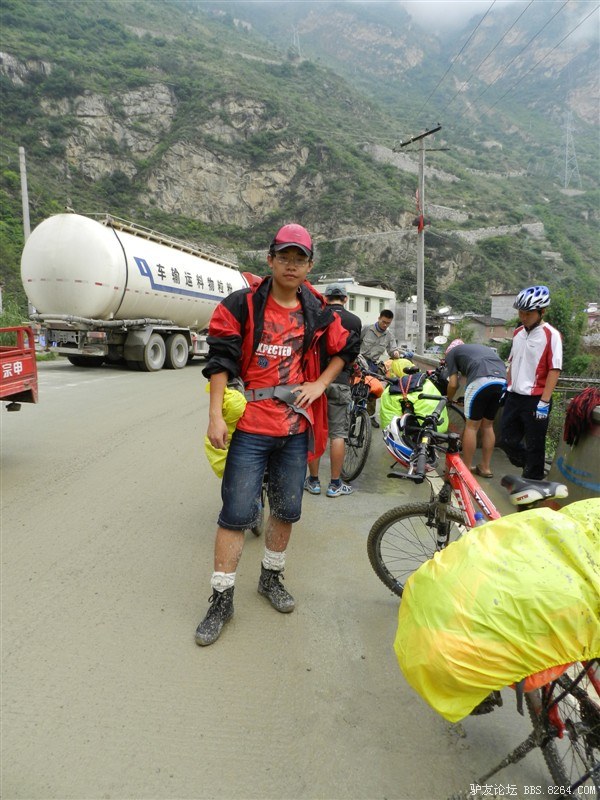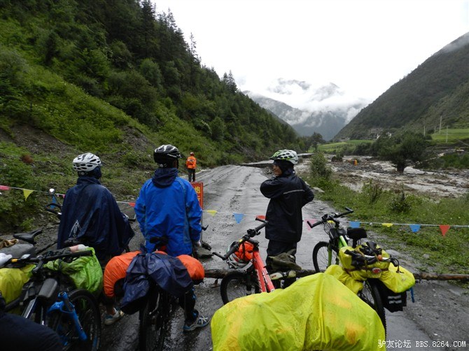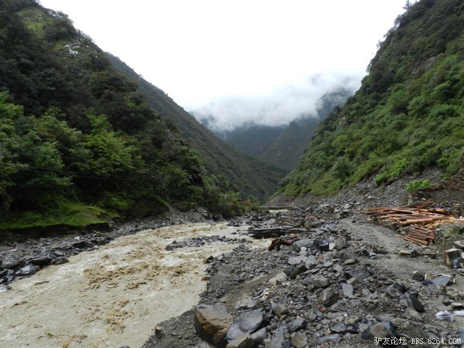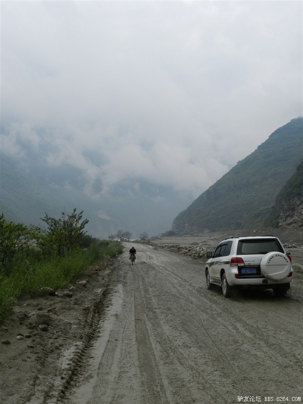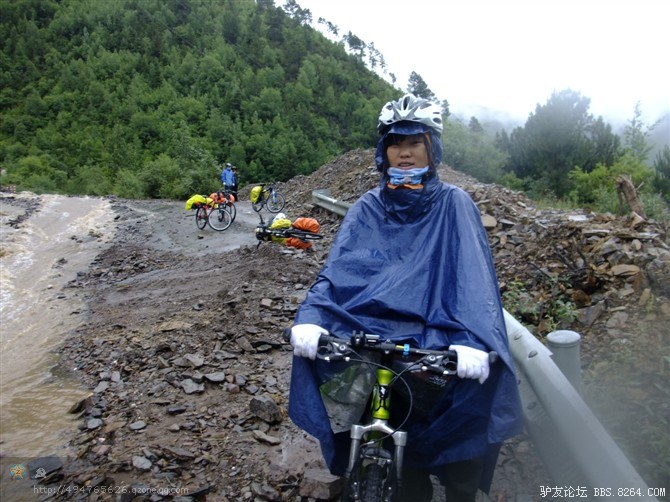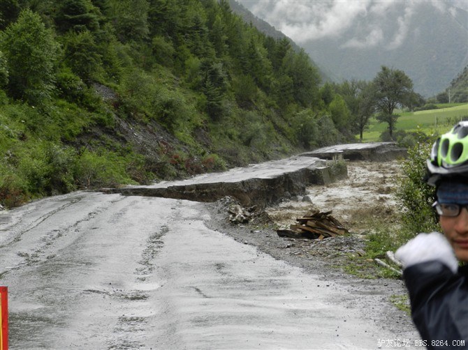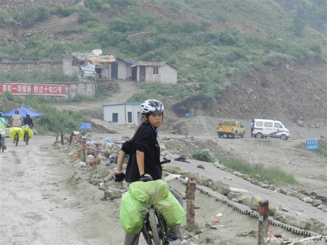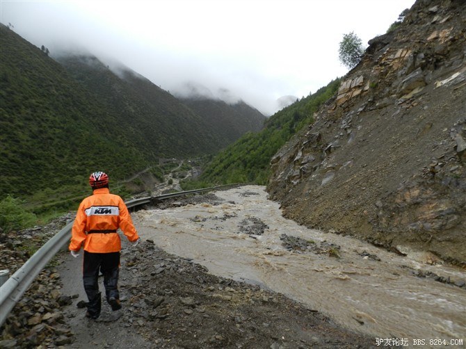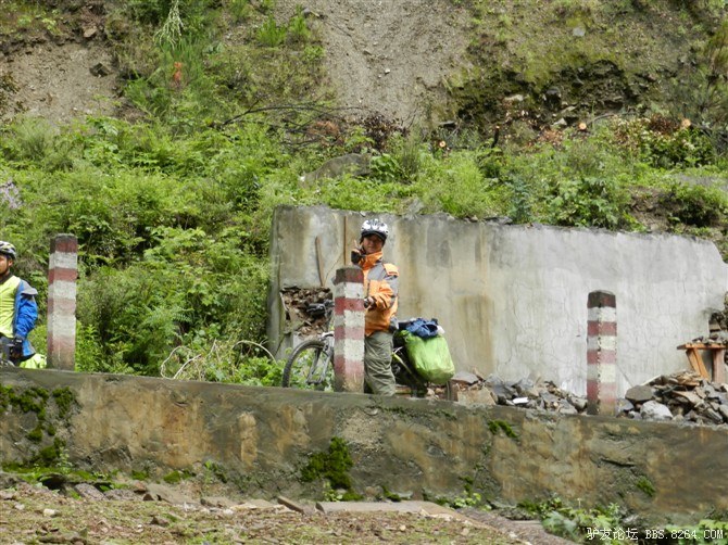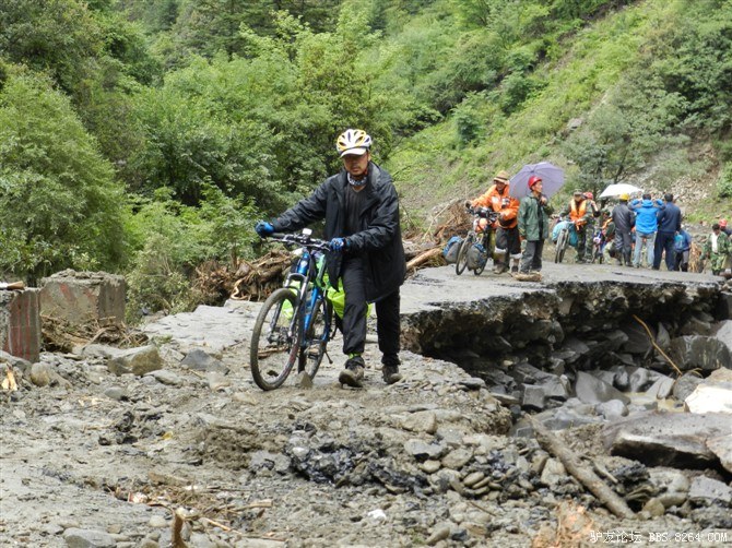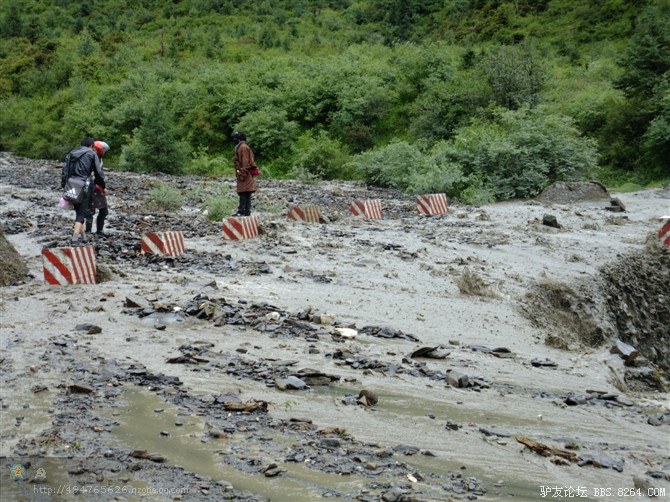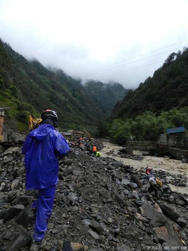 在解放军哥哥们用钢丝,圆木抢修好路面(机动车还是过不了),我们已经准备过去了。看见戚剑还停在原地犹豫着,我不知道我是哪来的信心,说了句,走吧,反正要向前走,和我们一起吧。 <br> 然后独身从北京出发的戚剑哥哥也加入了我们的队伍。