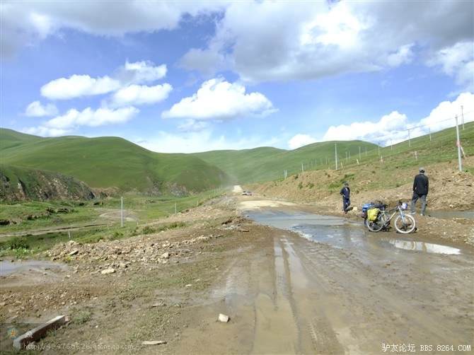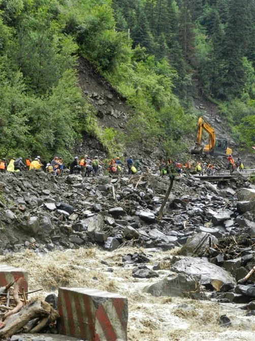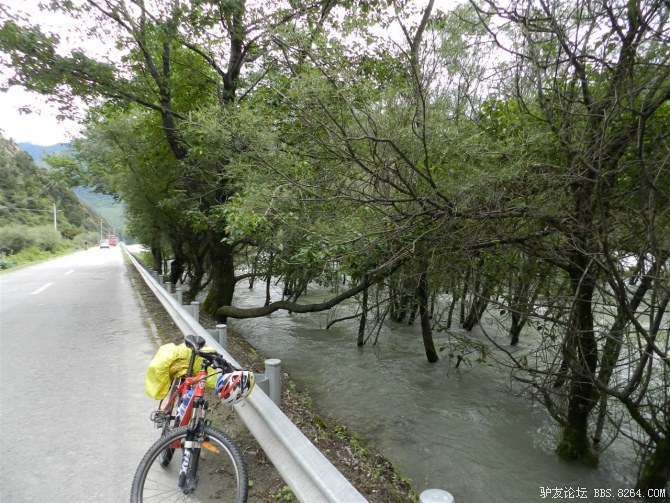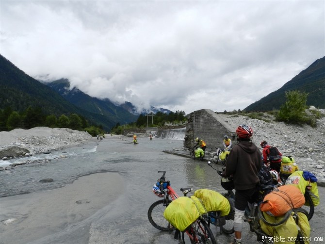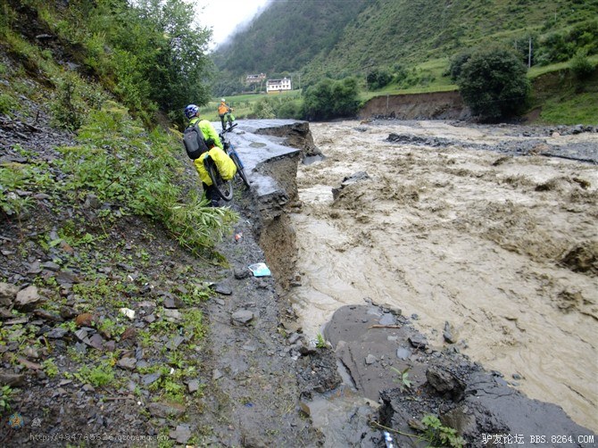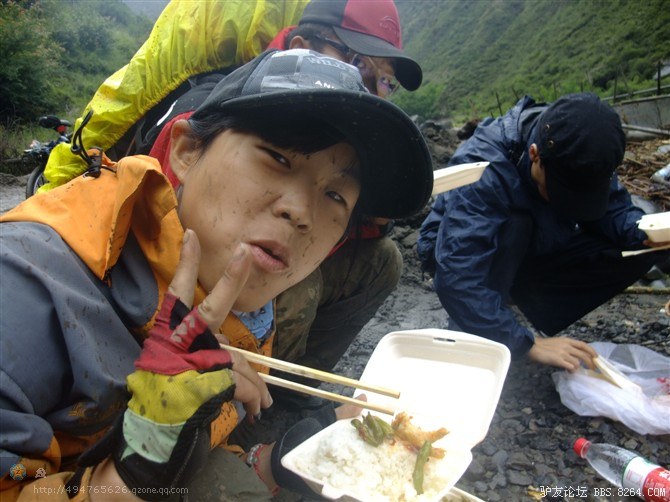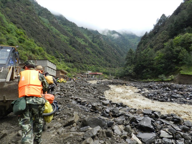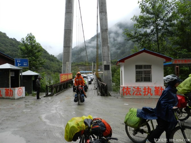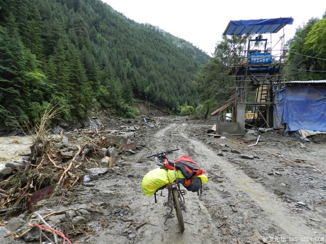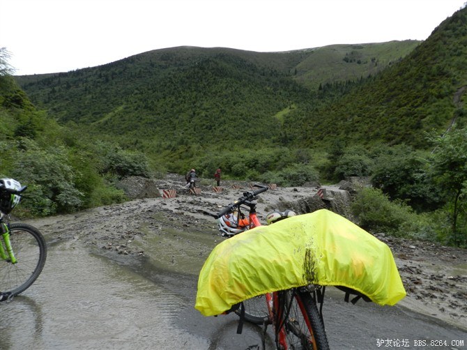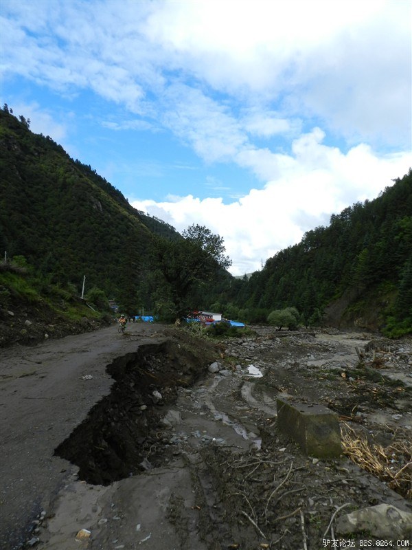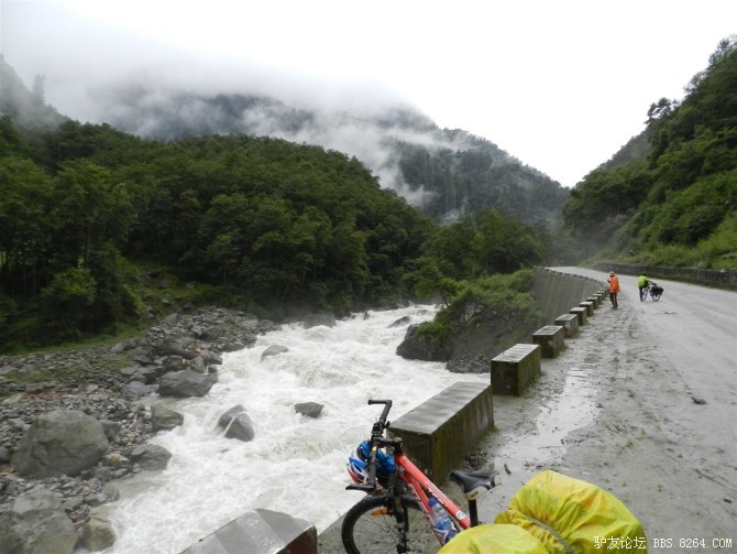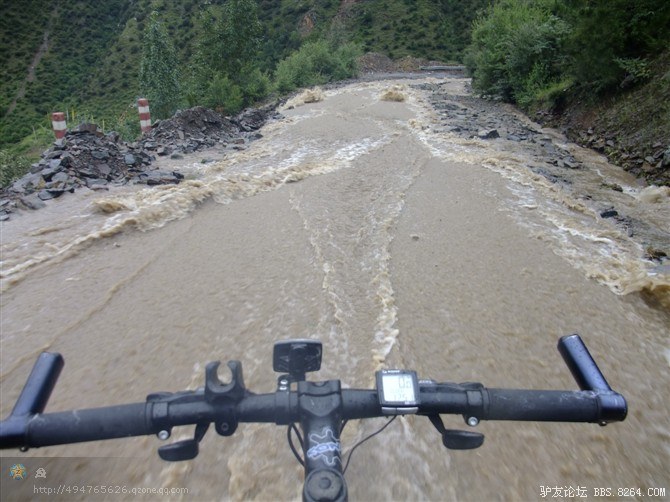 在解放军哥哥们用钢丝,圆木抢修好路面(机动车还是过不了),我们已经准备过去了。看见戚剑还停在原地犹豫着,我不知道我是哪来的信心,说了句,走吧,反正要向前走,和我们一起吧。 <br> 然后独身从北京出发的戚剑哥哥也加入了我们的队伍。