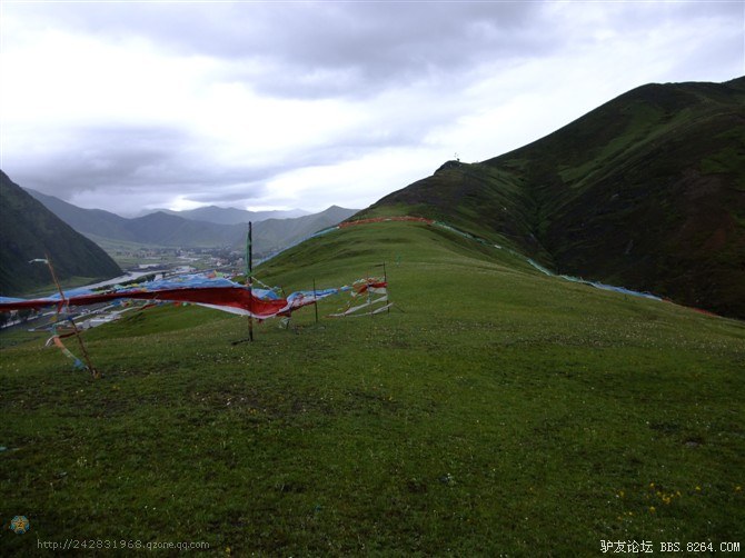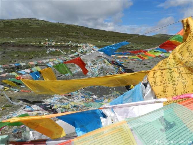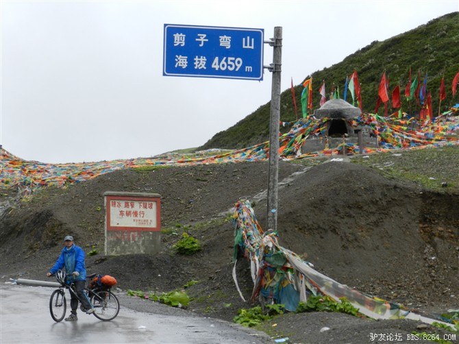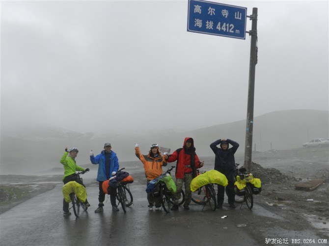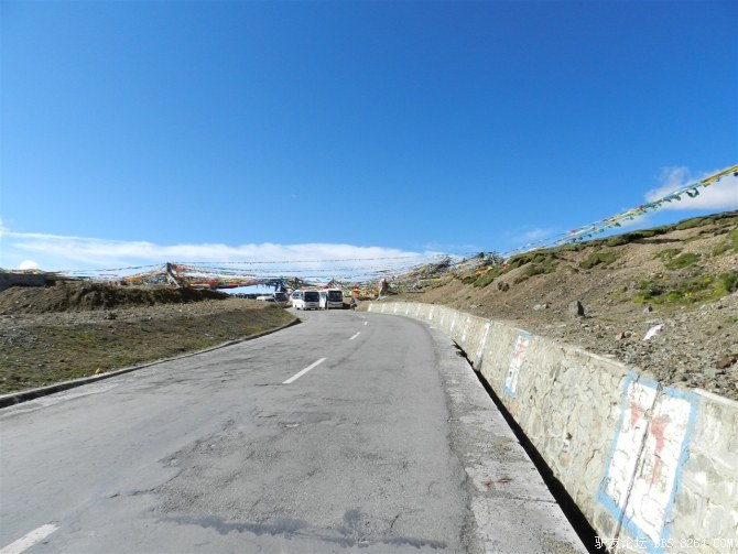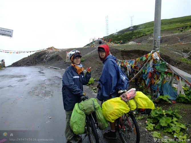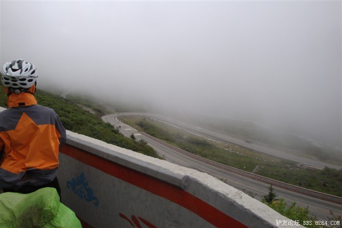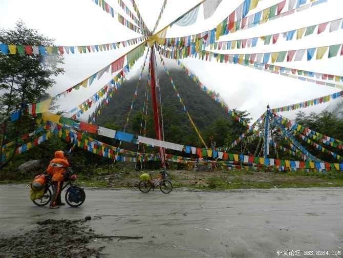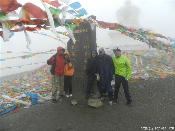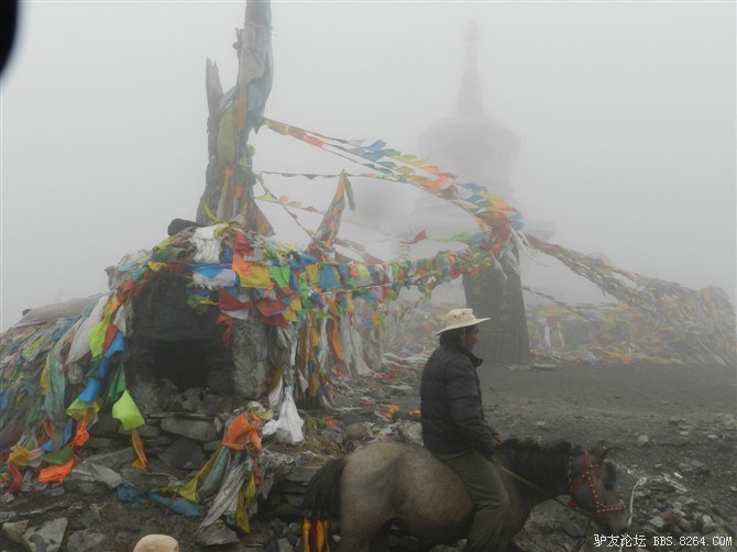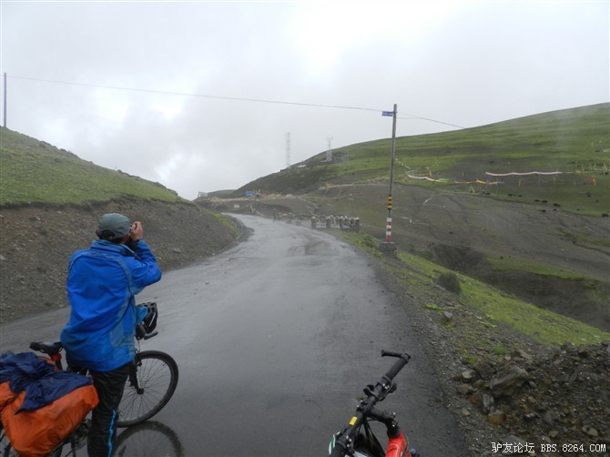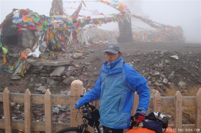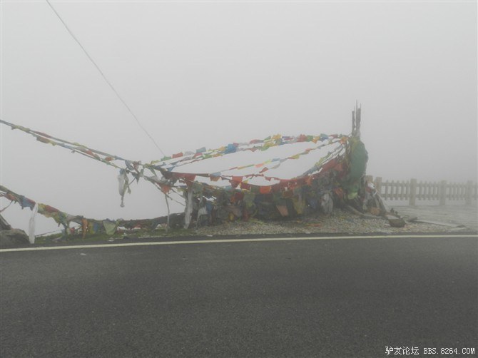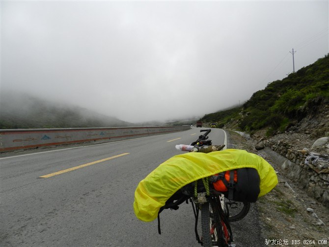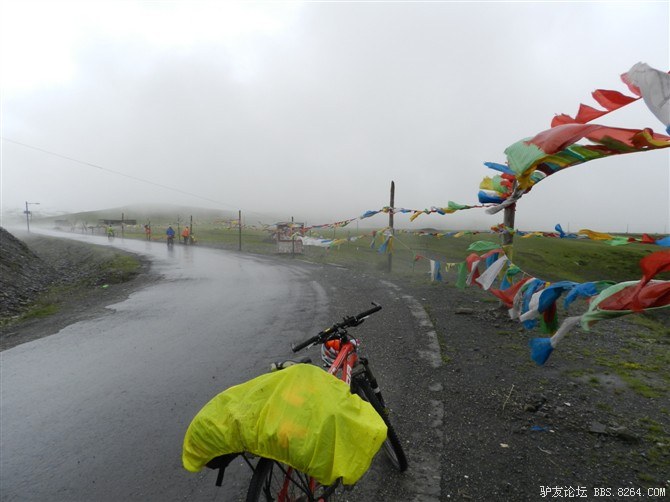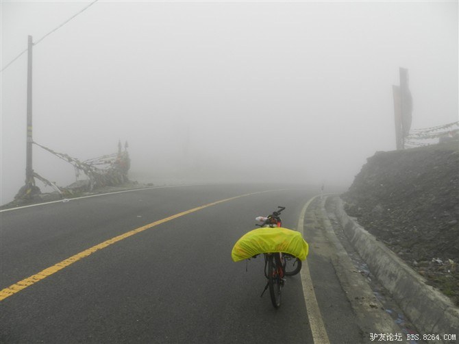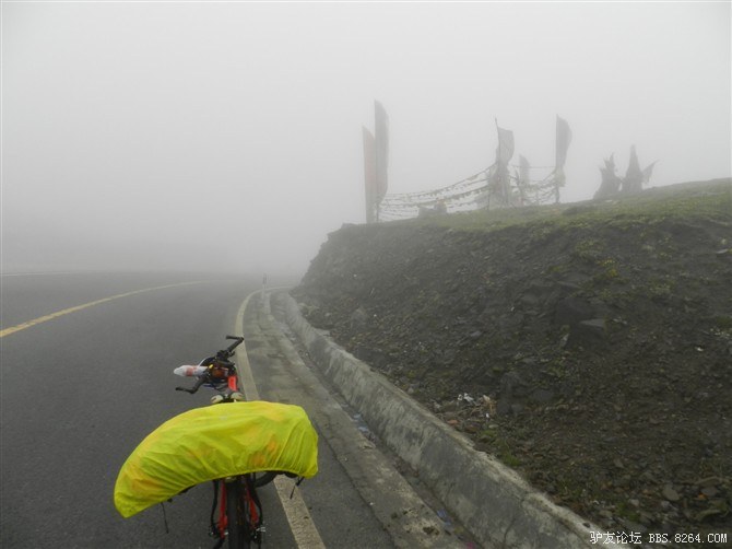 在我颓废的踏频下,全队缓缓的行进。快到山顶时,能见度已经不足10米了。第一次见识了高原上无穷无尽的缓上坡,终于还是忍不住下来推车了。而且推不到1公里就想罢工。其他的队友都骑到前面去了。只剩下小熊陪我。推了半个多小时,听见了前面队友的呼喊声。终于到山顶了,第一次看见了挂满垭口被风肆意拉扯的经幡,内心的情绪难以言表。我们都做到了,没有一个人放弃,没有一个人倒下。我想,拉萨离我们不远了!