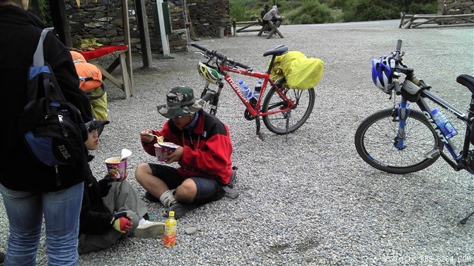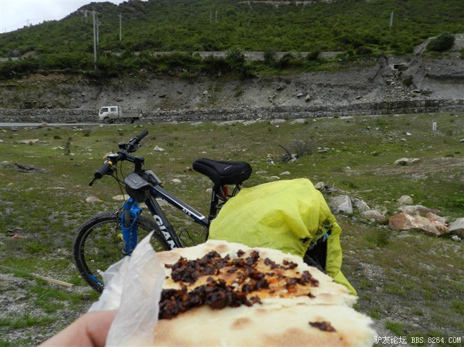 中午饿了,大家一起吃干粮--在康定买的锅盔,和着我带的红辣椒。增加体力和热量。 <br> 今天的天气很恶劣,上山时雾很大,越往山顶走能见度越低,之后慢慢下起了小雨。
