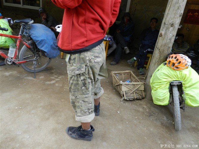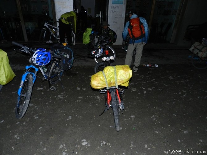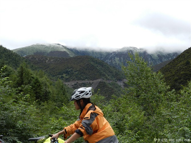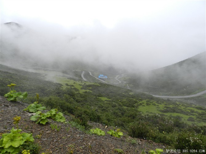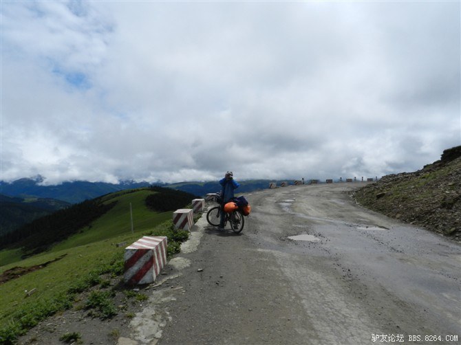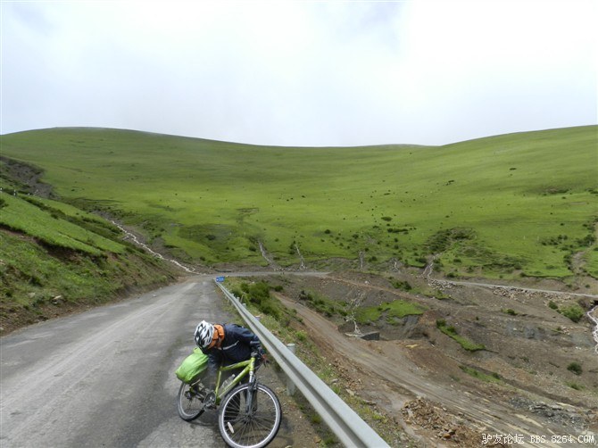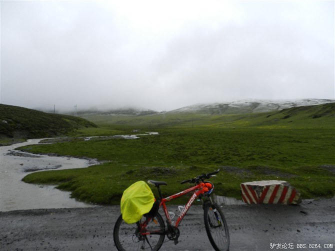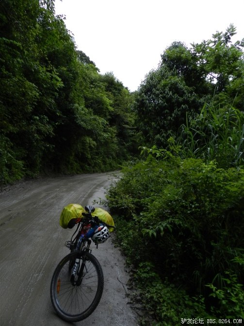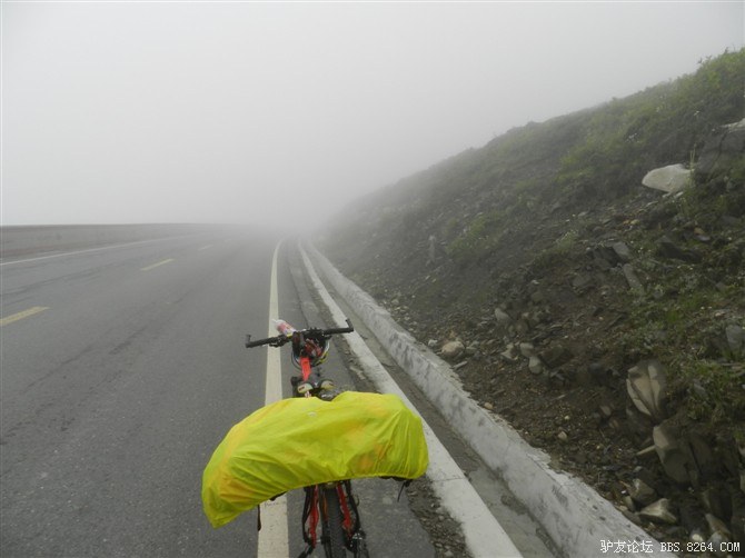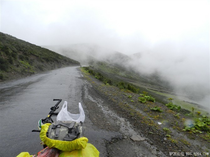 还在半山腰,湿气很重。氧气罐挂在车把上,随时准备救命用。