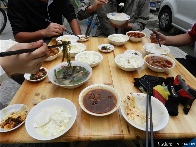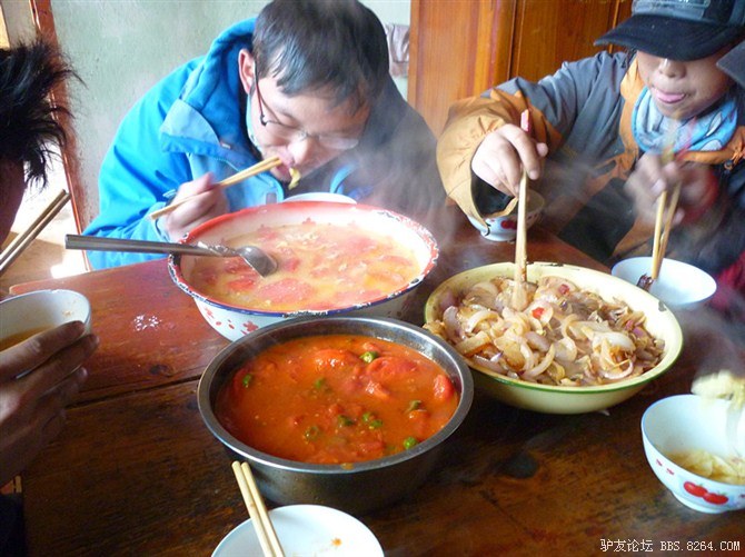 晚餐。话说在川藏线上,从来没有吃不完的菜。有时候菜汤都可以泡一碗饭吃。 <br> 很单纯,很满足阿~~