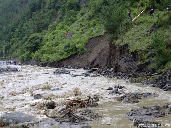 走了差不多5公里,还没有出小镇呢,就看见了一个塌方处,不是很宽,但水流很急,这边的人过不去,那边的人也过不来。两边站满了人,人后面停满了各种车。