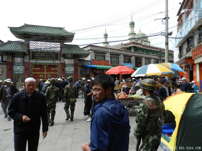寻找大昭寺的途中遇到的清真寺,寺外聚集了好多清真教的人,带着白帽子。 <br> 第一次知道,在拉萨,不到50米就会有一队武警。每个繁华的路口,都有武警驻守的岗亭。