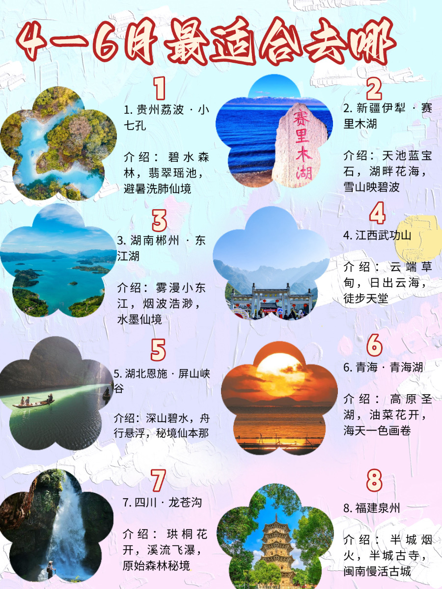 4-6月青海湖冰雪消融,湖水湛蓝,岸边油菜花渐次绽放,牛羊漫步草原。天气回暖,风光开阔治愈,环湖公路景色绝美,日出日落震撼人心。此时游客不多,气候舒适,既能感受高原圣湖壮阔,又能体验藏族风情,适合初夏出行。