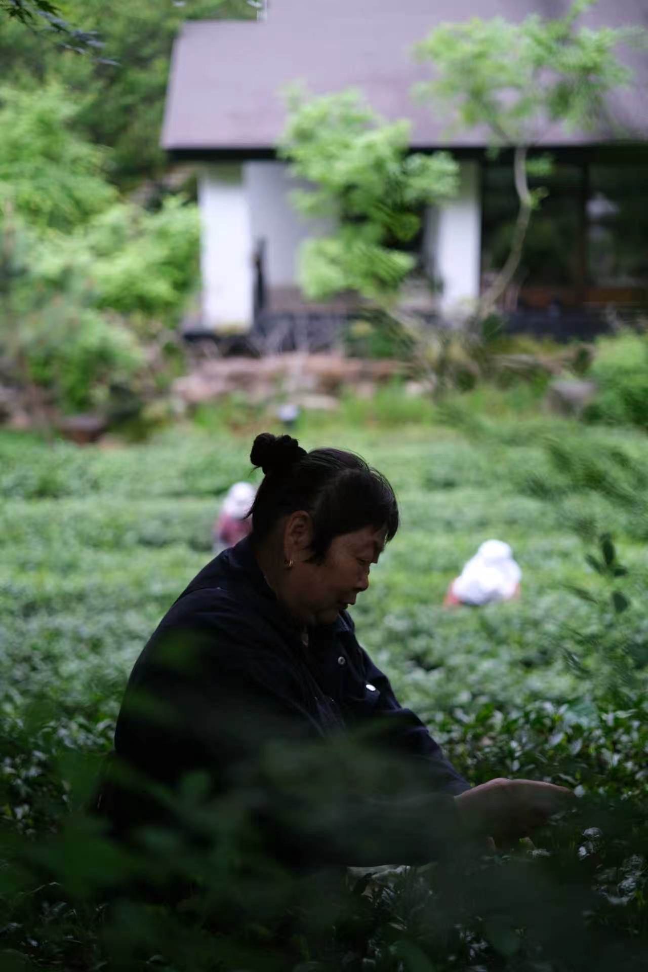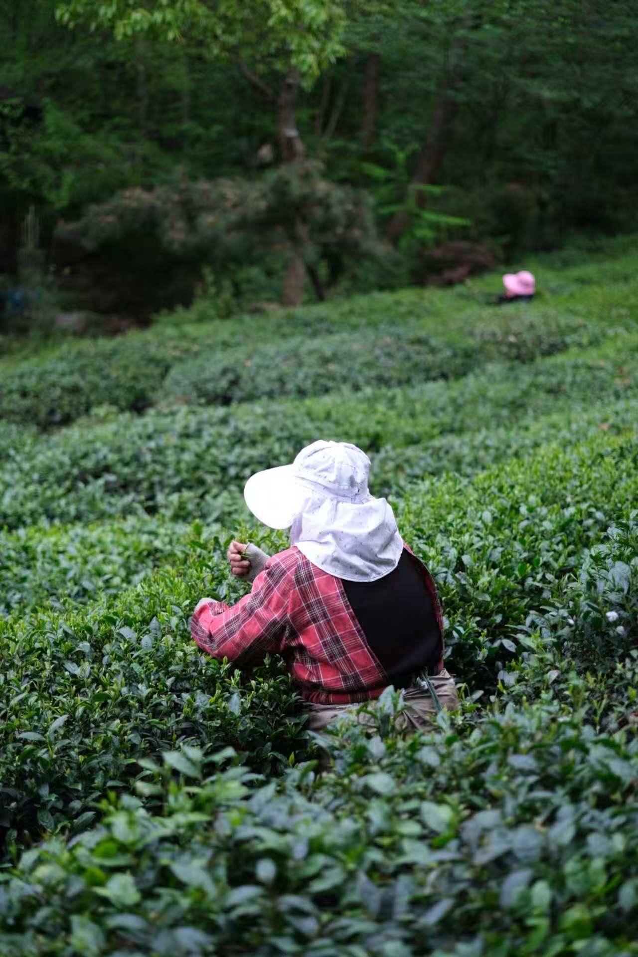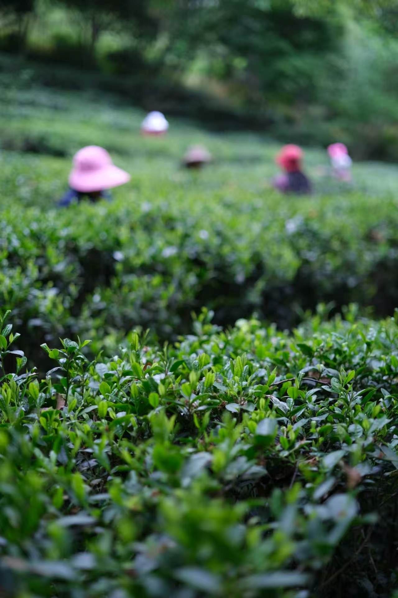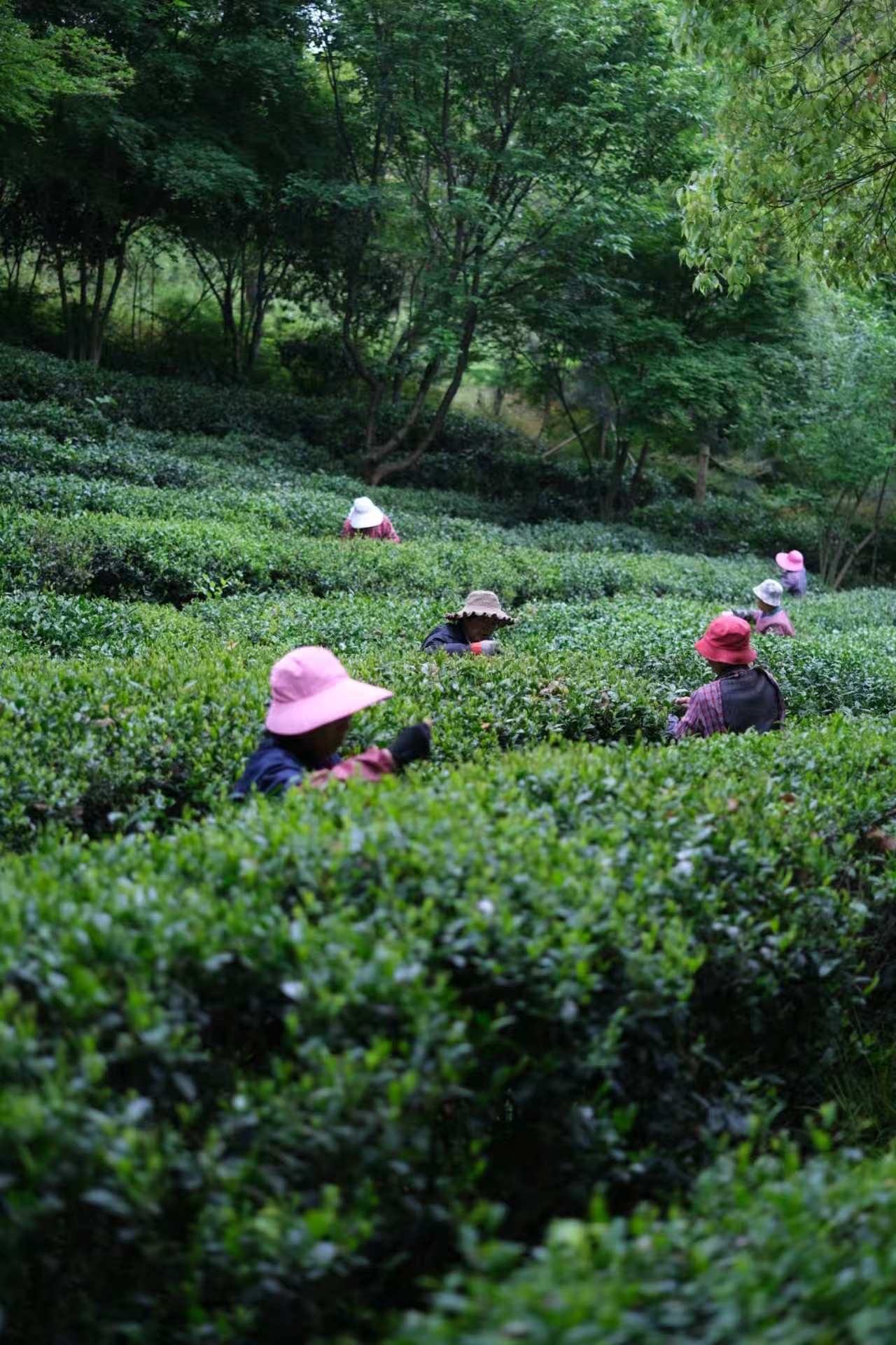 春山采茶忙 采摘标准:多为一芽一叶或一芽二叶 提采(轻捏上提),不掐、不扯,保芽形完整。 春分—清明—谷雨,越早越矜贵。 今天春山有九位采茶工,到下午看一下能采多少斤青叶[转圈] #春山在望度假酒店 #春山茶