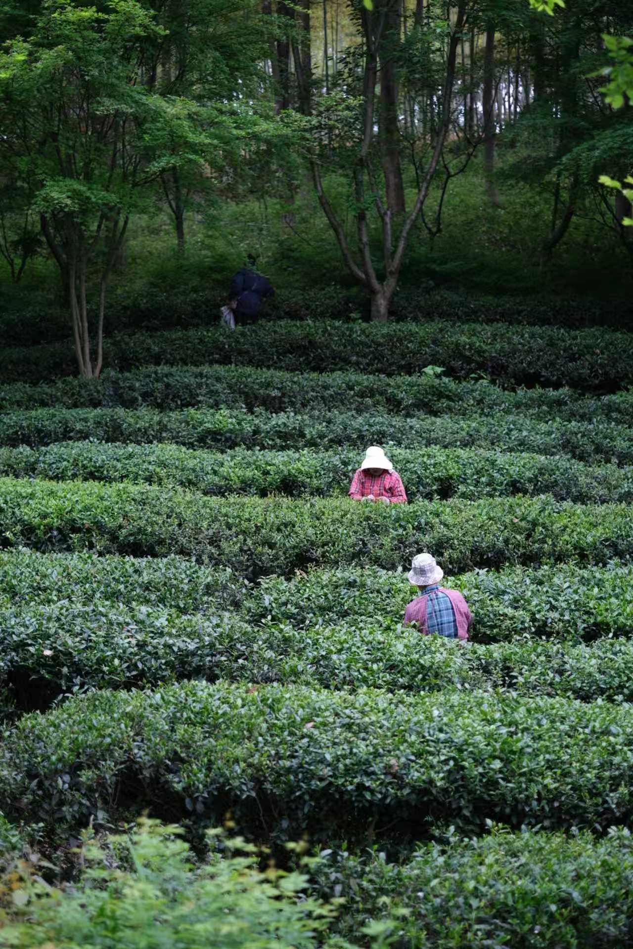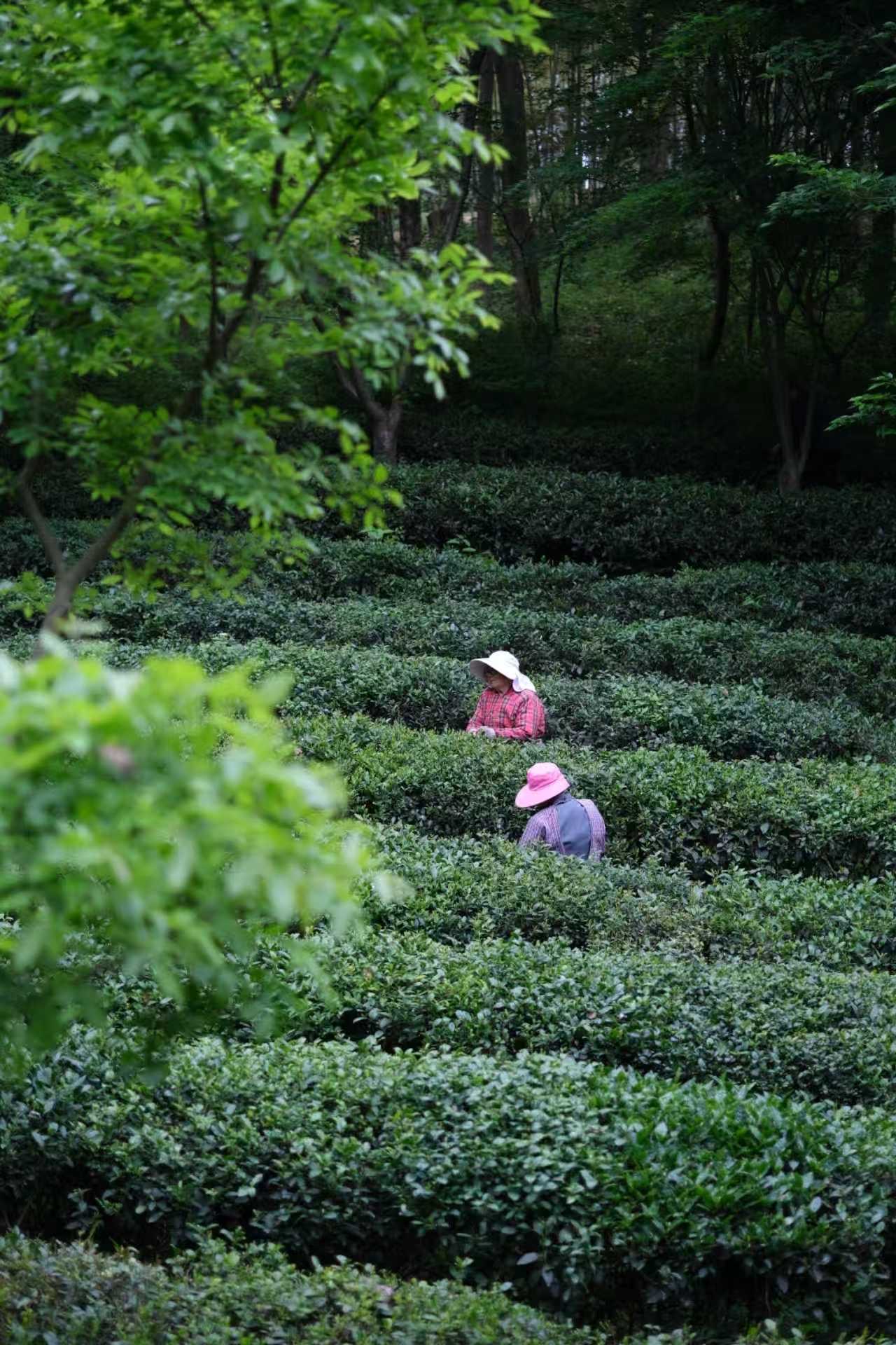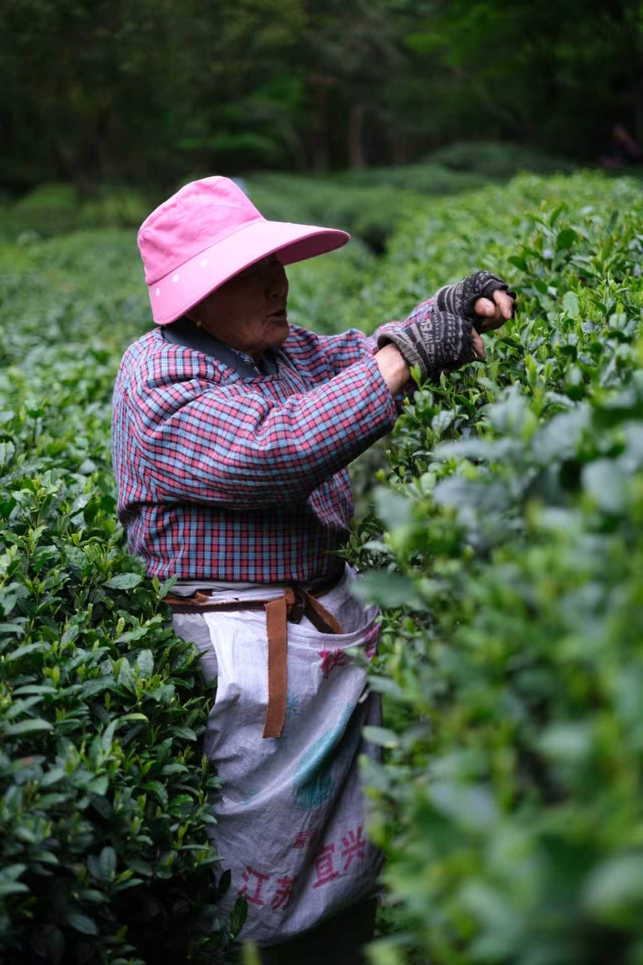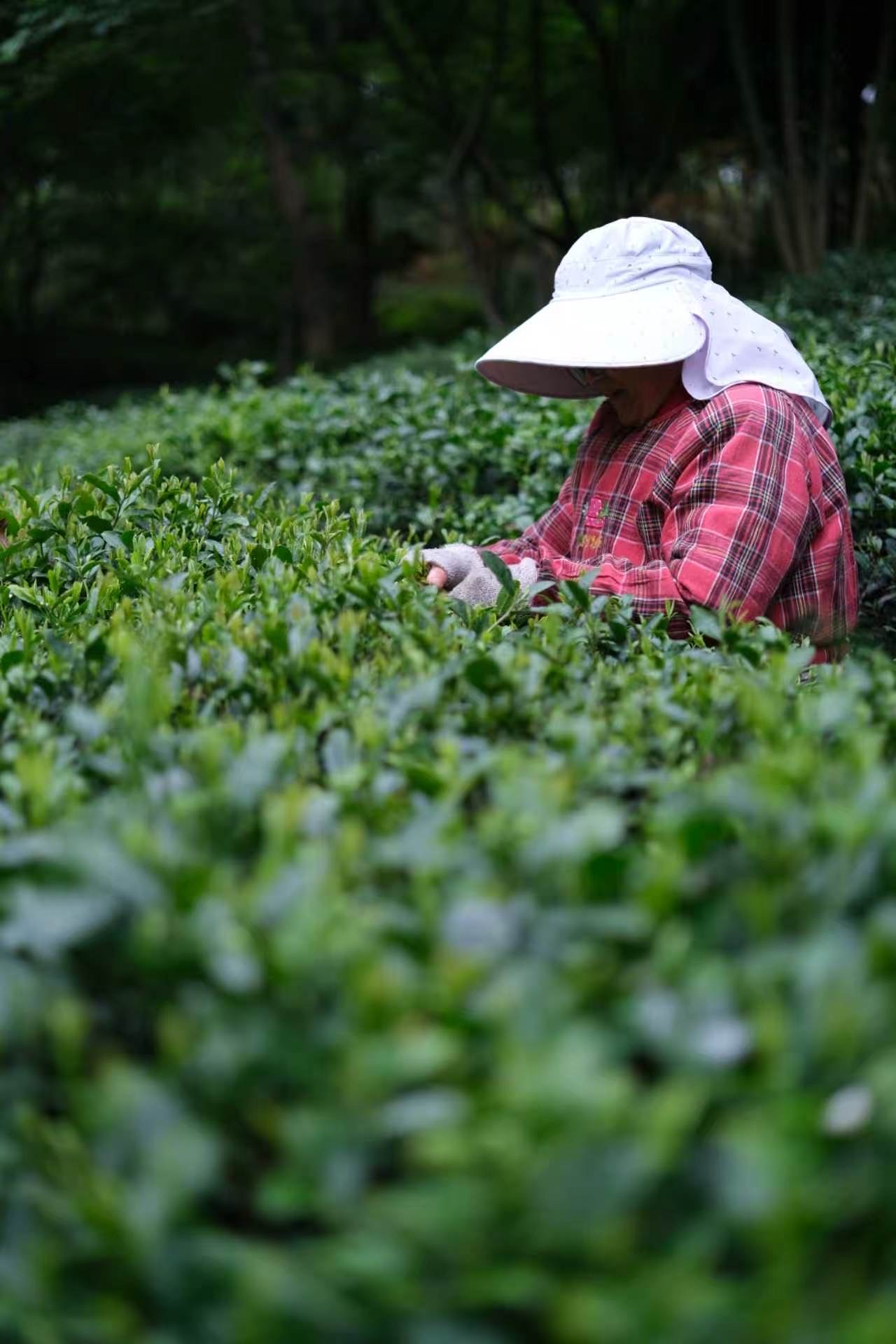 春山采茶忙 采摘标准:多为一芽一叶或一芽二叶 提采(轻捏上提),不掐、不扯,保芽形完整。 春分—清明—谷雨,越早越矜贵。 今天春山有九位采茶工,到下午看一下能采多少斤青叶[转圈] #春山在望度假酒店 #春山茶