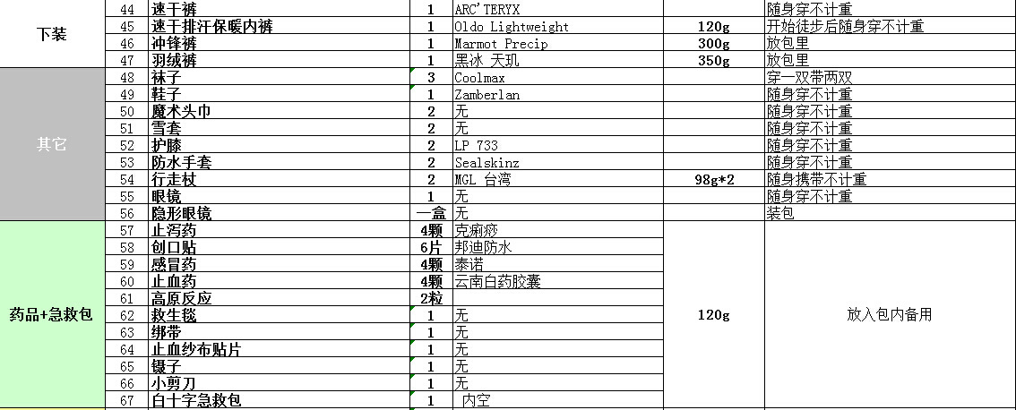 这样我的包就从8Kg左右的负重,降低到了6kg左右,这个重量如果去鳌太是不可能的,走5天的线路怎么也会背10kg。对我的装备清单感兴趣的朋友,可以查看后面附的装备清单表,这里就不一一例举了。