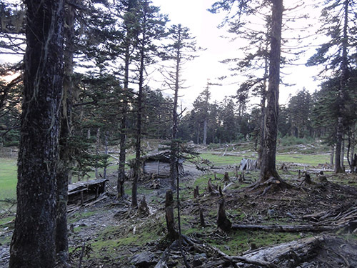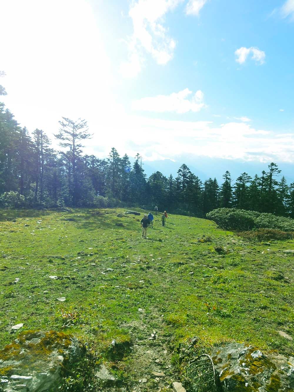 在阿洛家查看的地图上显示,第一天的最高海拔应该是3800米,当我们到达松林线前的草地时,我的GPS正显示海拔高度在3800米,于是我想当然的认为这一天的爬升已经结束了,还与同伴庆贺了一番,好好地在草坪上晒了一会儿太阳。
