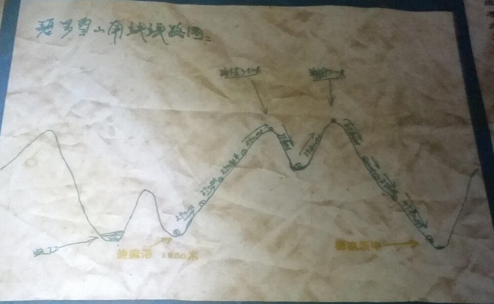 (我在阿洛家墙壁上发现的徒步路线图,不是很清楚,可以看见全程主要翻越两个垭口,经历如驼峰般的两个山峰,两次在牧场扎营。图片左边显示,我们今天的徒步总共11个小时,8个小时上升,3个小时下降,事实证明,一点不差!)