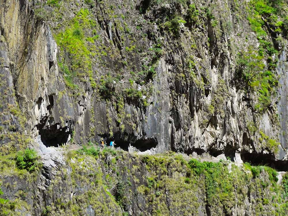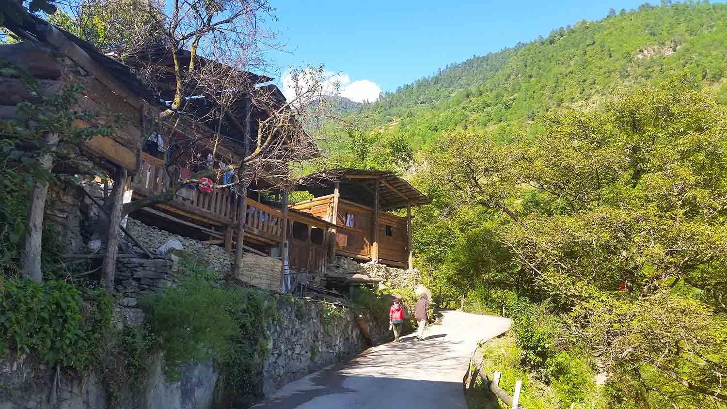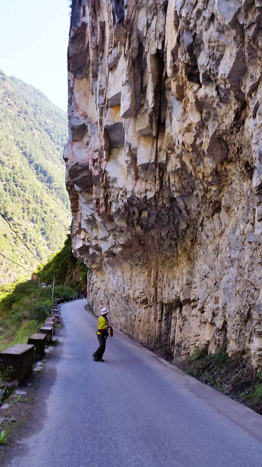 (经过一段看起来非常危险的塌方区,美女不由抬头张望,要是做过坏事,此时不该扪心自问?) <br> 就这样不紧不慢地徒步了约5个小时,经过一个边防哨卡,我们抵达了这天的目的地秋那桶村。