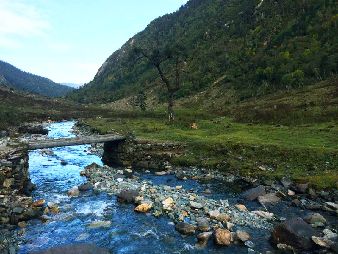 (沿着河走,这是真正的雪山融水,清澈美丽却冰冷刺骨,倘若失足掉落,恐怕不是会不会游泳的问题,而是是否立刻休克的危险。)