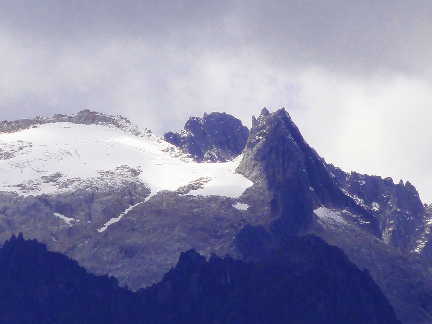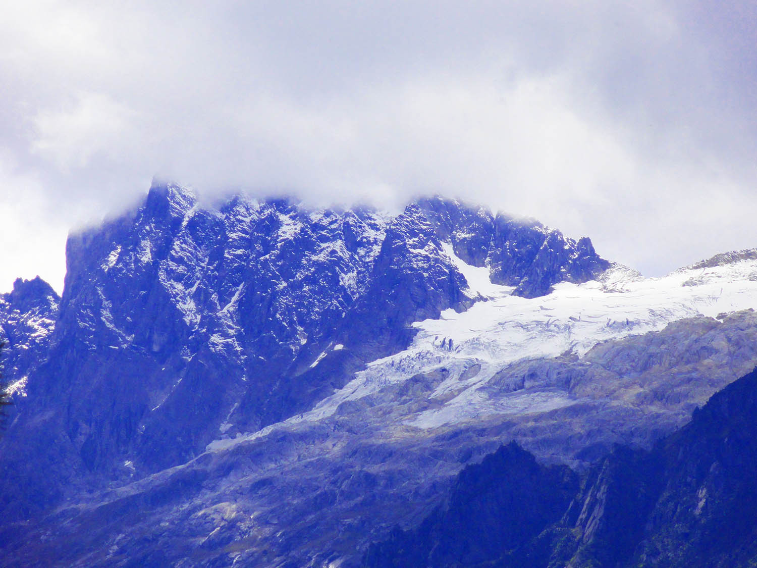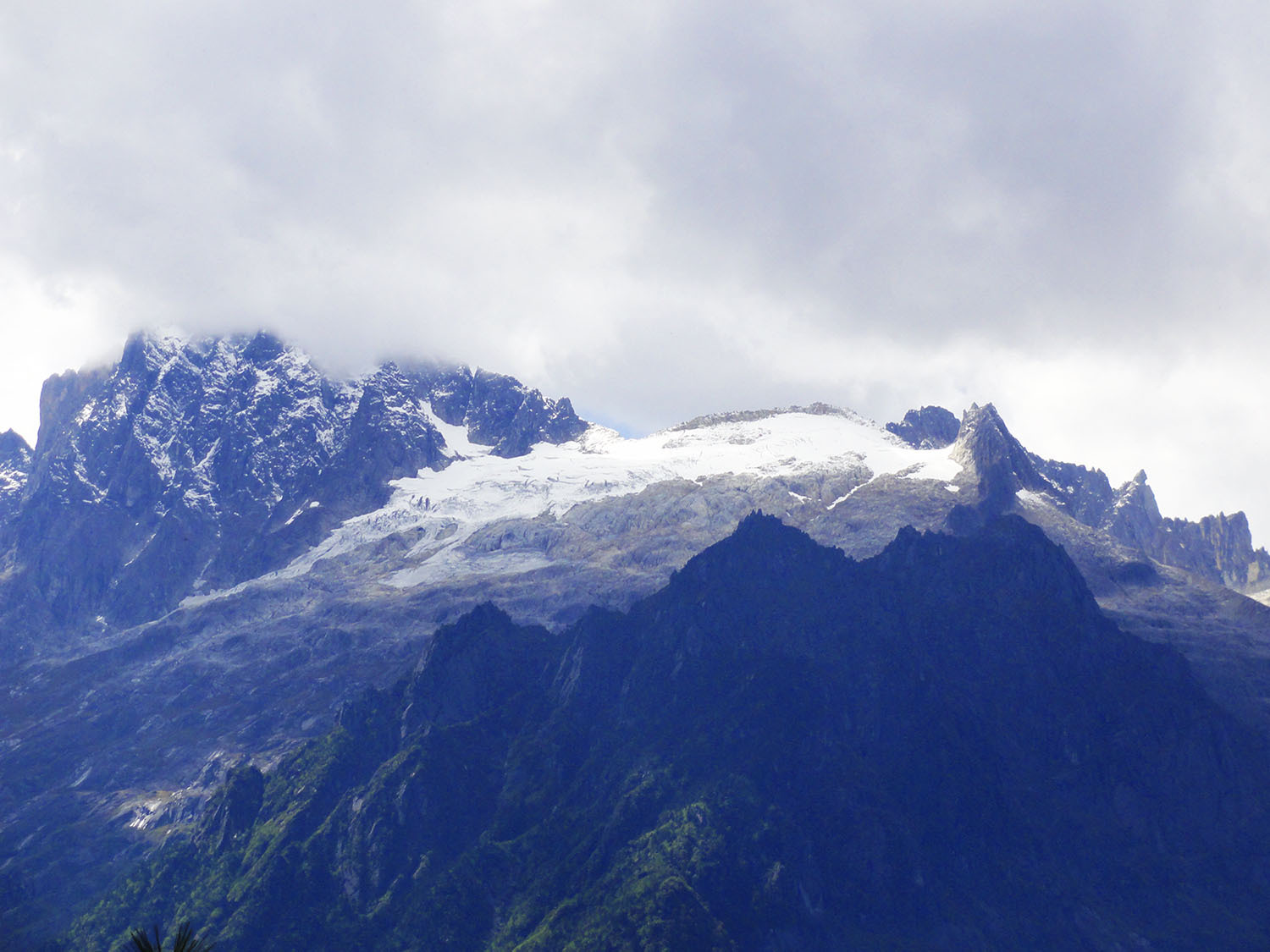 穿出丛林,终于登顶,此时远眺雪山,只见雪山上果然白雪皑皑,冷峻的岩石与巨大的冰川交相辉映,冰川上的雪在阳光下熠熠生辉。