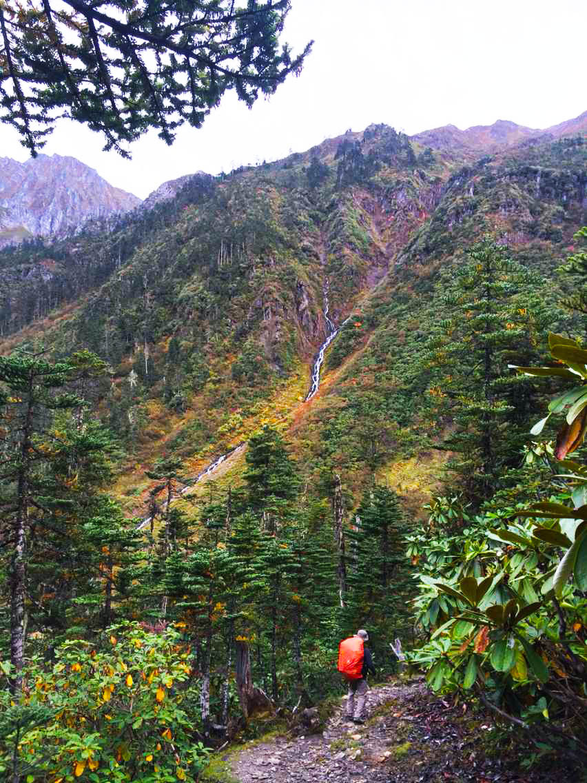 这条下山的路并不好走,一路都在原始丛林中穿梭,而坡度非常陡峭,且路上经常被流水切断,或者有巨石阵挡道,或者遍布松散的小碎石,不但登山鞋坚硬的鞋底踩上去很搁脚,对膝盖也是一大负担,需要时刻利用腿部的肌肉来阻止自己的下坠。