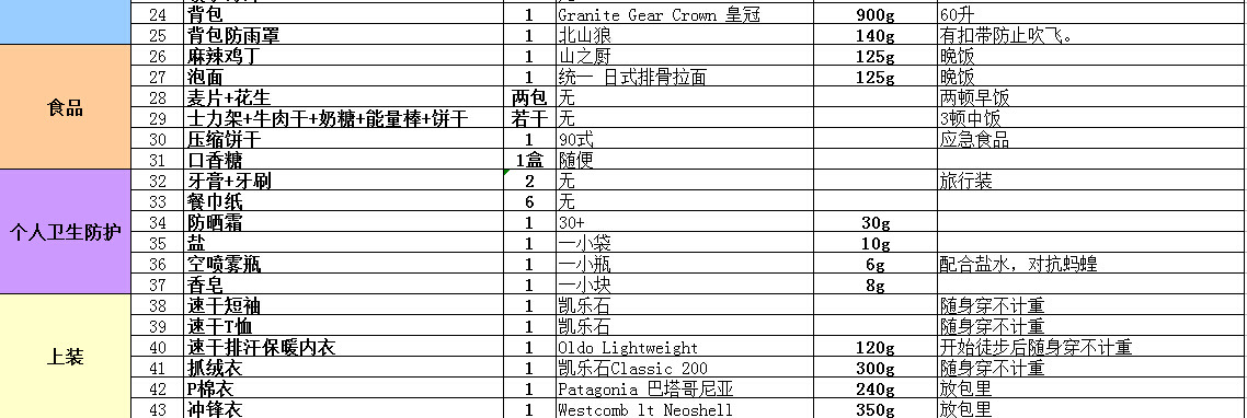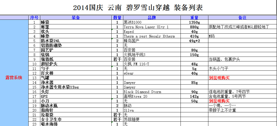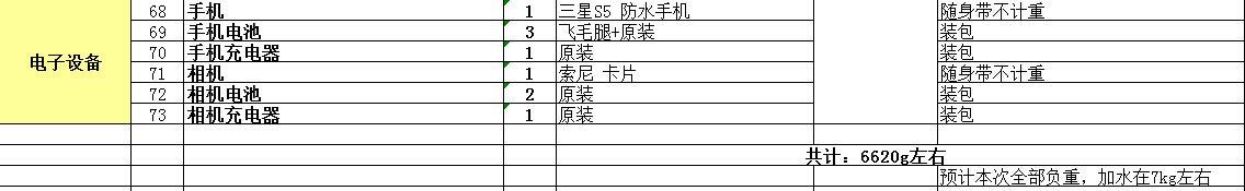 最后把这次带的装备清单列一下,因为去之前查天气连日阴雨,考虑了很多防雨措施,后来连日放晴,就没有带,例如吸水用的大海绵之类。