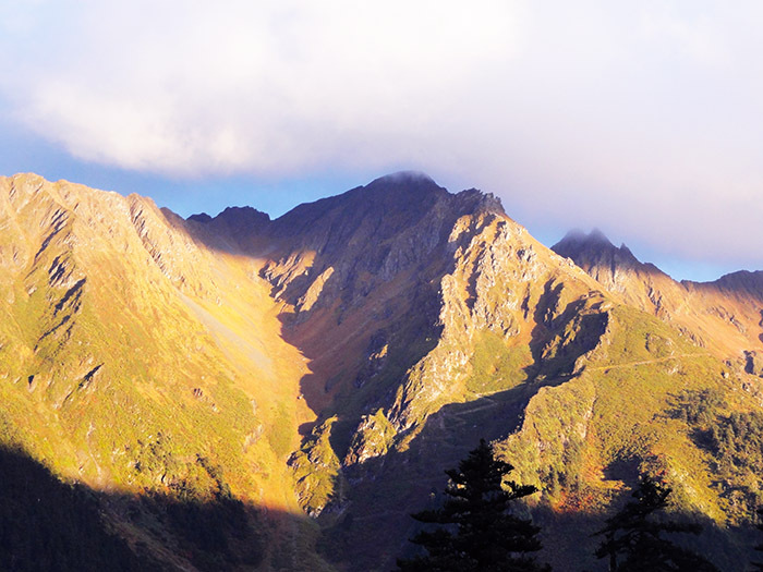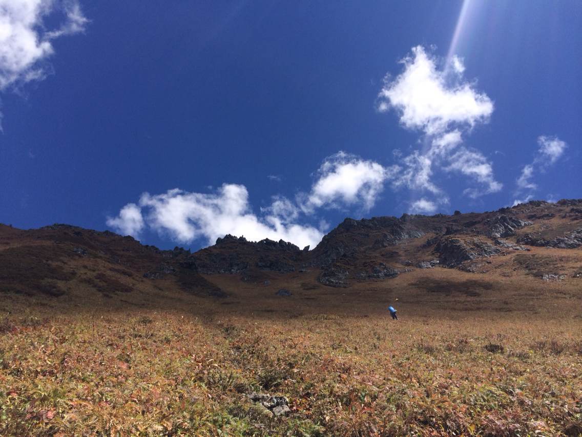 当阳光从初卡牧场所在峡谷中升起,这一路上最最壮美的高原风景便展现在了我们面前。今天的路径异常清晰,垭口遥遥在望,按照阿洛家地图的显示,上升需要约3个小时,下降需要约3个小时,一共6个小时。前进吧,骚年们!
