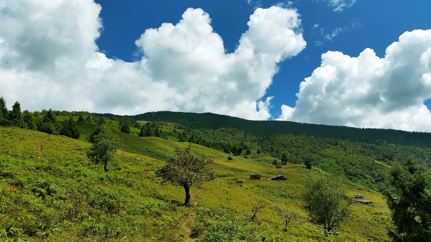 忘记走了多久,大约下午1:00之前,我翻过一个上坡,离开一片松林,眼前突然出现了一片高山牧场,远处蓝天四垂,辽阔天地,长风当歌,此后风景越加动人。